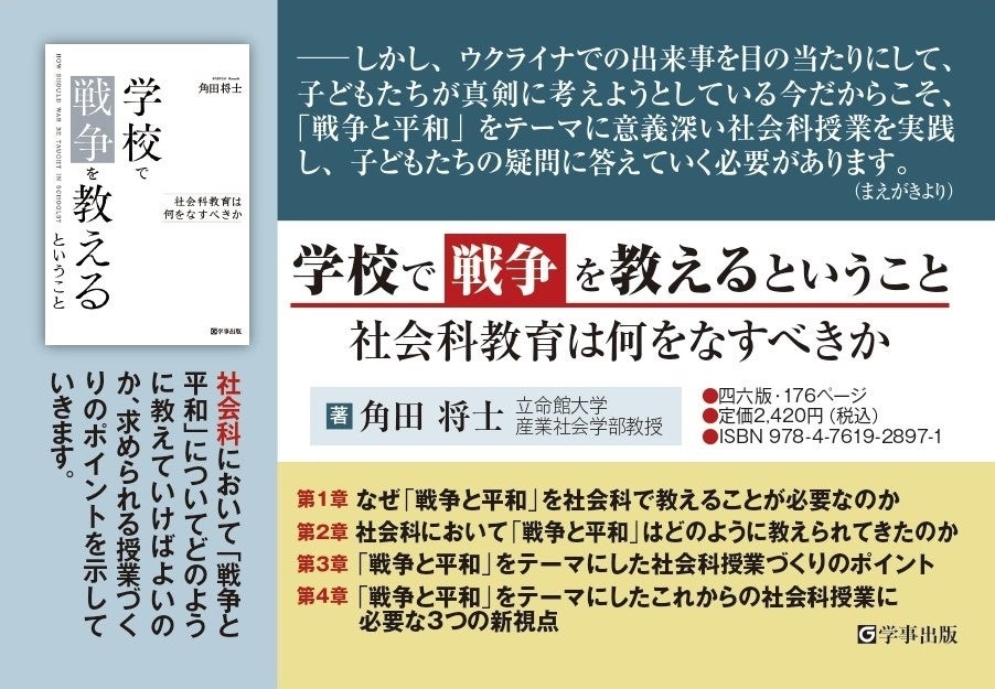 教育書を幅広く刊行する学事出版株式会社(本社:東京都千代田区)は、『学校で戦争を教えるということ-社会科教育は何をなすべきか-』(角田 将士 著)を刊行いたしました。