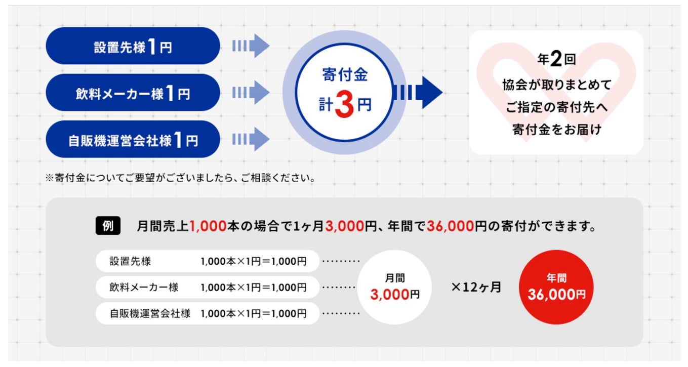 募金型自動販売機は、設置するだけで募⾦につながるSDGs推進型⾃販機となっており、飲料1本の売り上げにつき、設置者様1円、飲料メーカー様1円、自販機運営会社様1円の合計3円をNPOや自治体などに寄付する仕組みです。ボランティア・ベンダー協会では、1994年4月より募金活動をスタートし、2022年度までに累計1億6千万円以上の募金が集まっています。