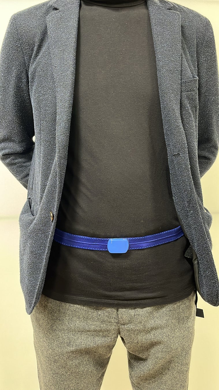 寝る直前に、服の上からみぞおちにベルトを巻き、ベルトのホックに本体を装着するだけで、睡眠測定ができます。
