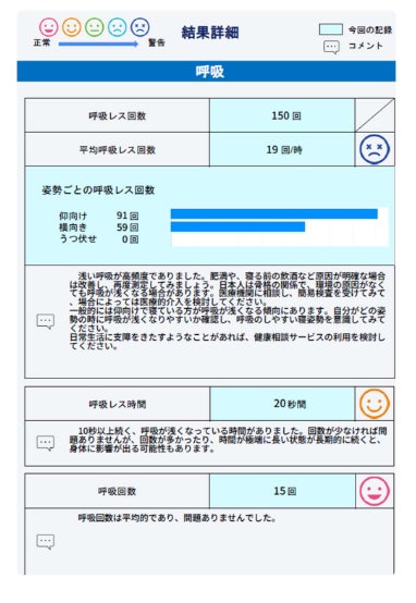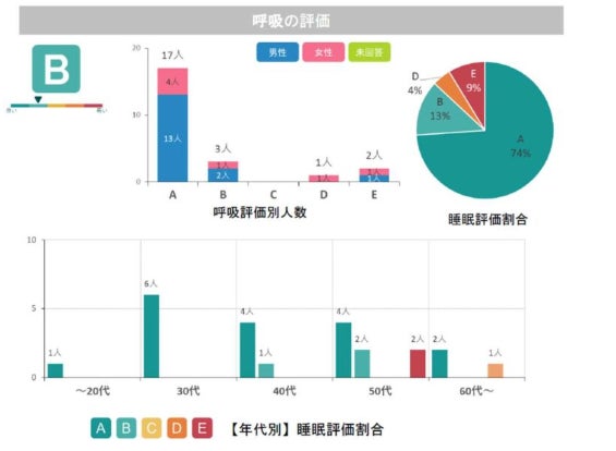 レポートは、睡眠の深さや姿勢、呼吸の状態などを可視化し、A〜Eの5段階で評価が行われ、個別コメントも自動で掲載されます。