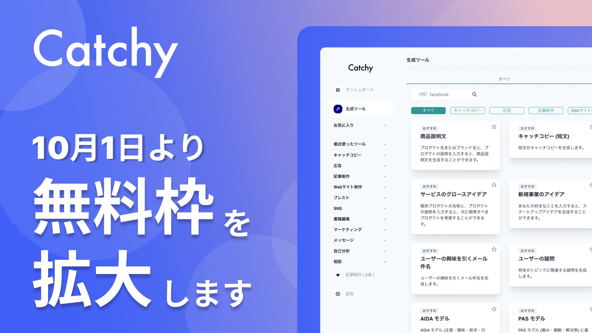 「Catchy」の無料プラン改定により毎月最大10回まで文章生成が可能に