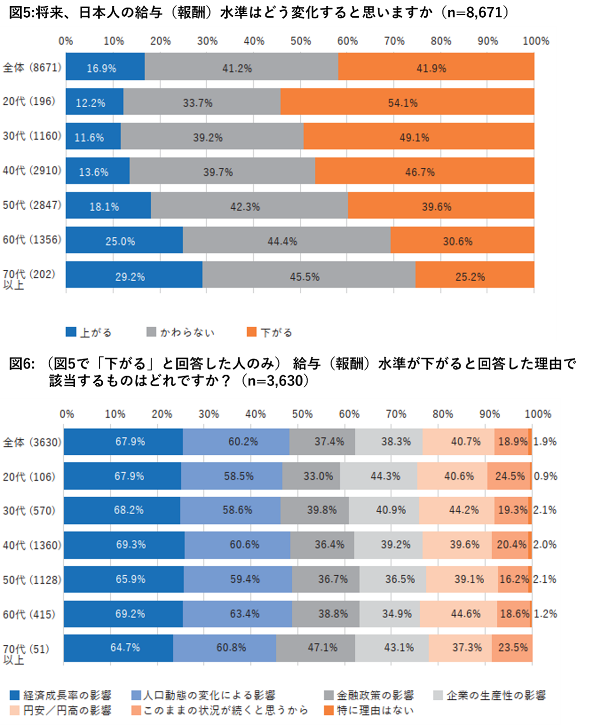 「将来、日本の給料(報酬)水準はどう変化すると思うか?」という質問では、「上がる(16.9%)」を「下がる(41.9%)」が大きく上回る結果になりました。「将来の日本の給料水準は下がる」と回答した割合は、20代の54.1%から年代が上がるにつれて段階的に下がっていき、世代が若いほど日本の給与水準が下降していくと考えていることがわかりました(図5)。