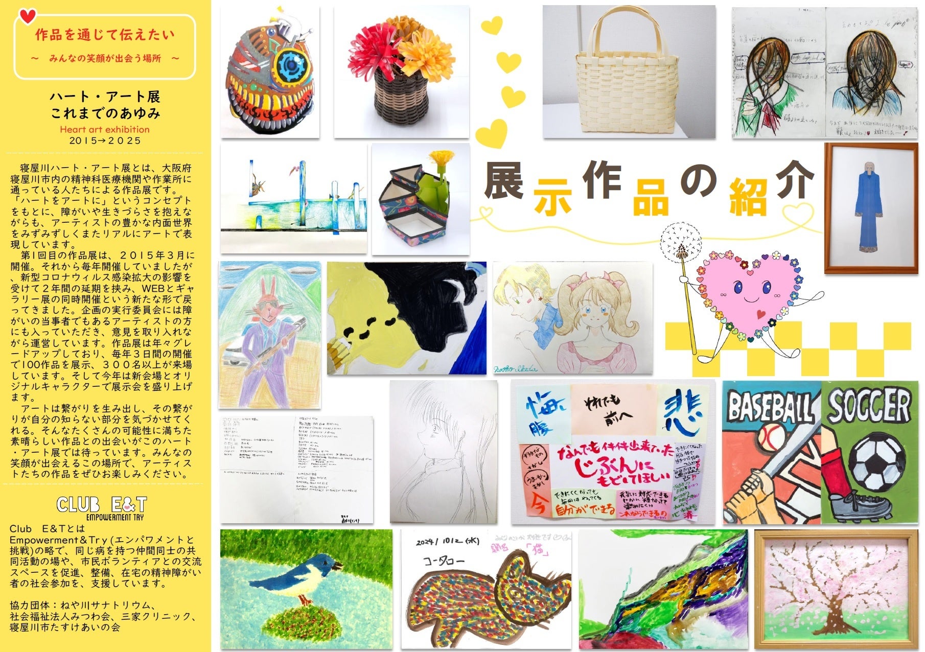 約30年前からClub E&Tという(Empowerment&Tryエンパワメントと挑戦という略)、当会を含くむ寝屋川市内の協力団体(ねや川サナトリウム、三家クリニック、社会福祉法人みつわ会、寝屋川市民たすけあいの会)が、同じ病を持つ仲間同士の共同活動の場や、市民ボランティアとの交流スペースを促進、整備、在宅の精神障がい者の社会参加を支援する活動を取り組んできました。その活動の中から「アート」を通して発信するひとつの交流を、町づくりのひとつとして取り組んでいきたいという思いからスタートしました。