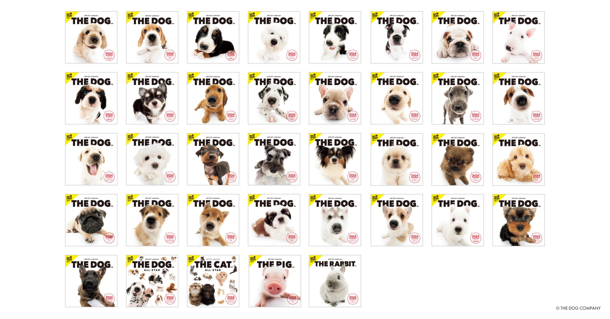 魚眼レンズで撮影された犬や猫のユニークな表情が特徴的な「THE DOG」のカレンダーは、2001年の発売から現在まで世界各国で販売され、累計約520万部のロングセラーヒット商品として愛されてきました。2024年版は、新たにブル・テリア、ダルメシアン、ジャーマン・シェパード・ドッグの3犬種が大判サイズに仲間入りした豊富なラインアップの全75種(大判、ミニ、卓上の3サイズ展開)をご用意しました。