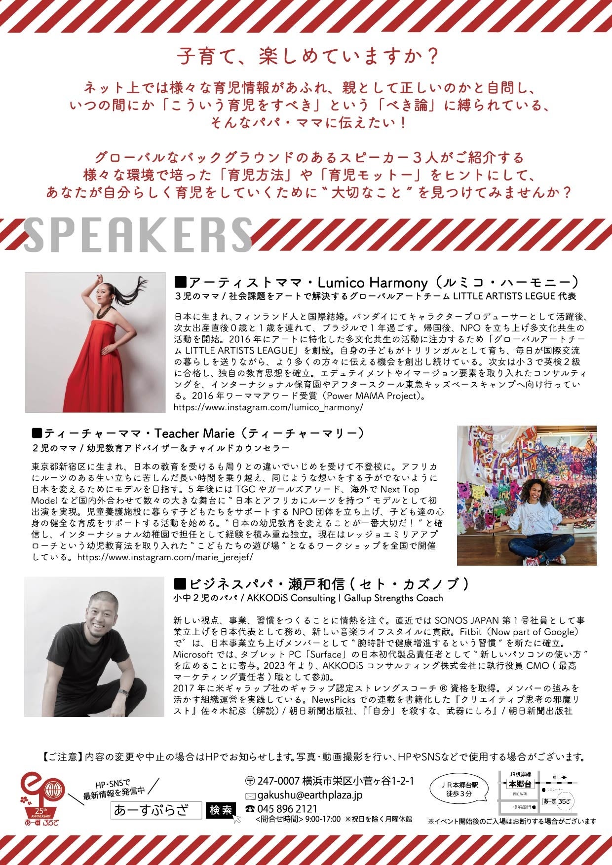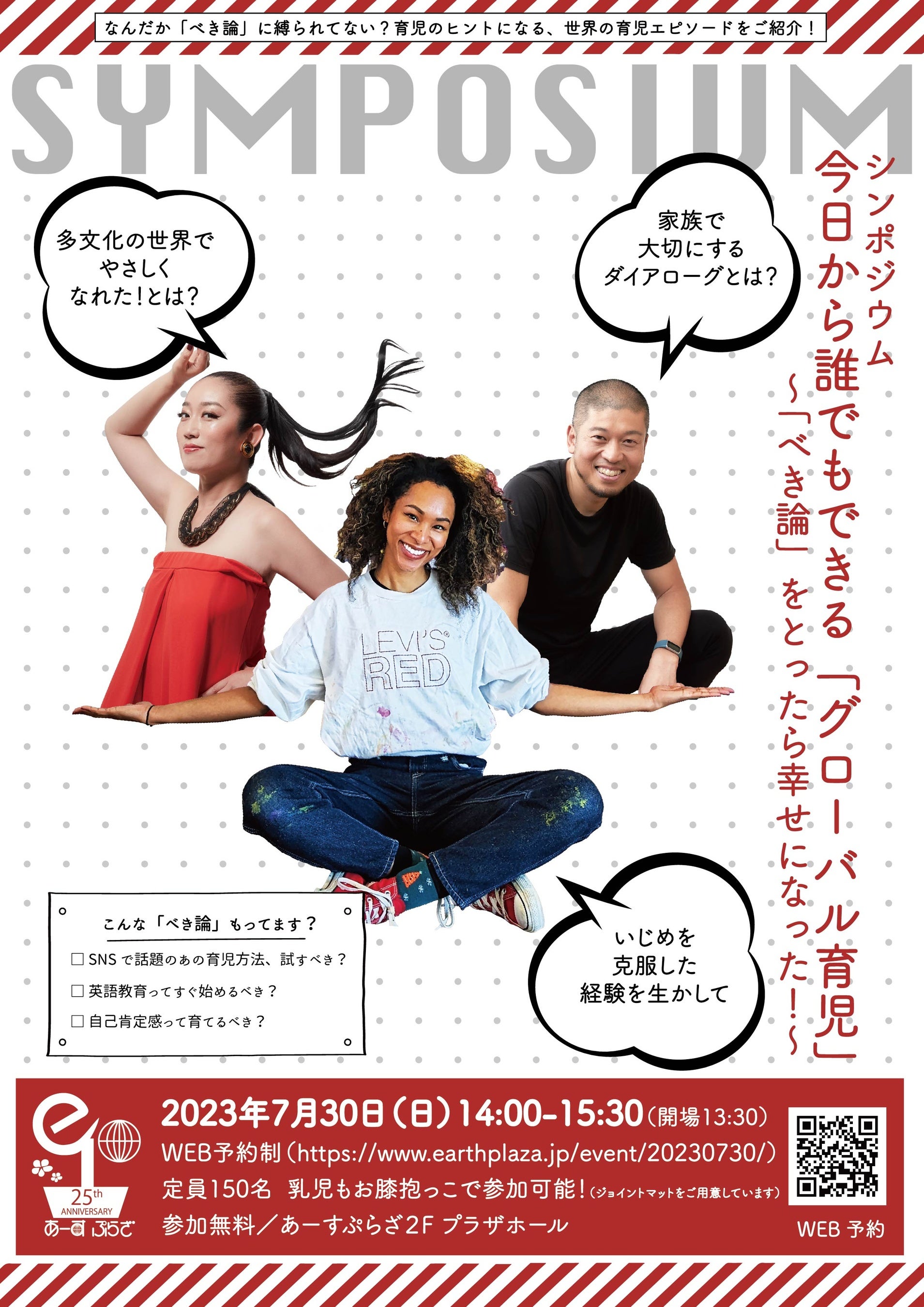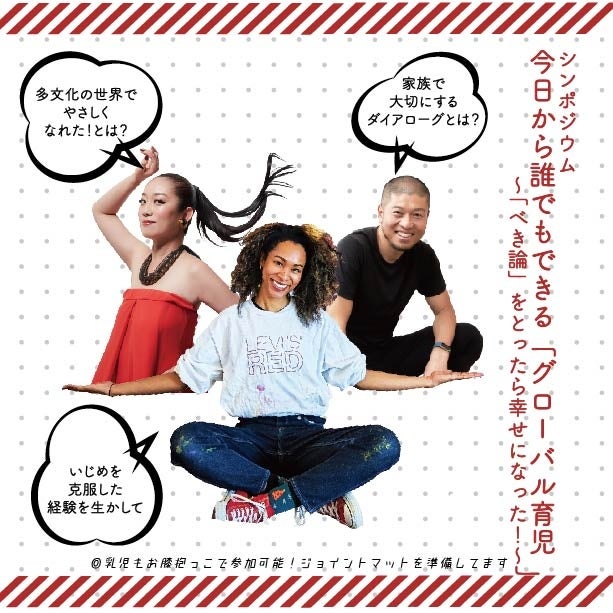 ネット上で様々な育児情報があふれ、親として正しいのか自問し、いつの間にか「こういう育児をすべき」という「べき論」に縛られている、そんなパパ・ママに伝えたいシンポジウムです。グローバルなバックグラウンドのあるスピーカーに様々な環境で培った「育児方法」や「育児モットー」を紹介いただきます。それらは決して特別な方法ではなく、日夜悩むパパ・ママに「自分らしく育児をしていくために”大切なこと”」を見つけてもらえるヒントになるはずです。