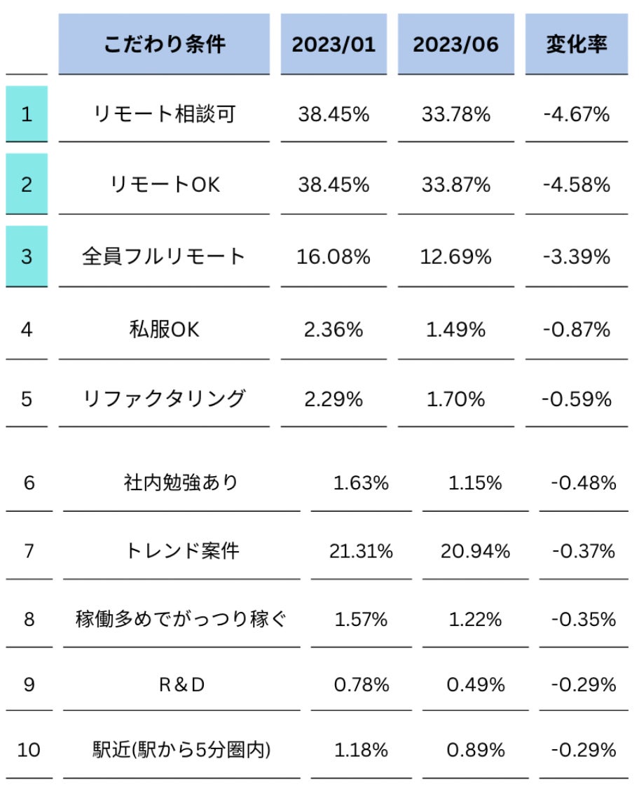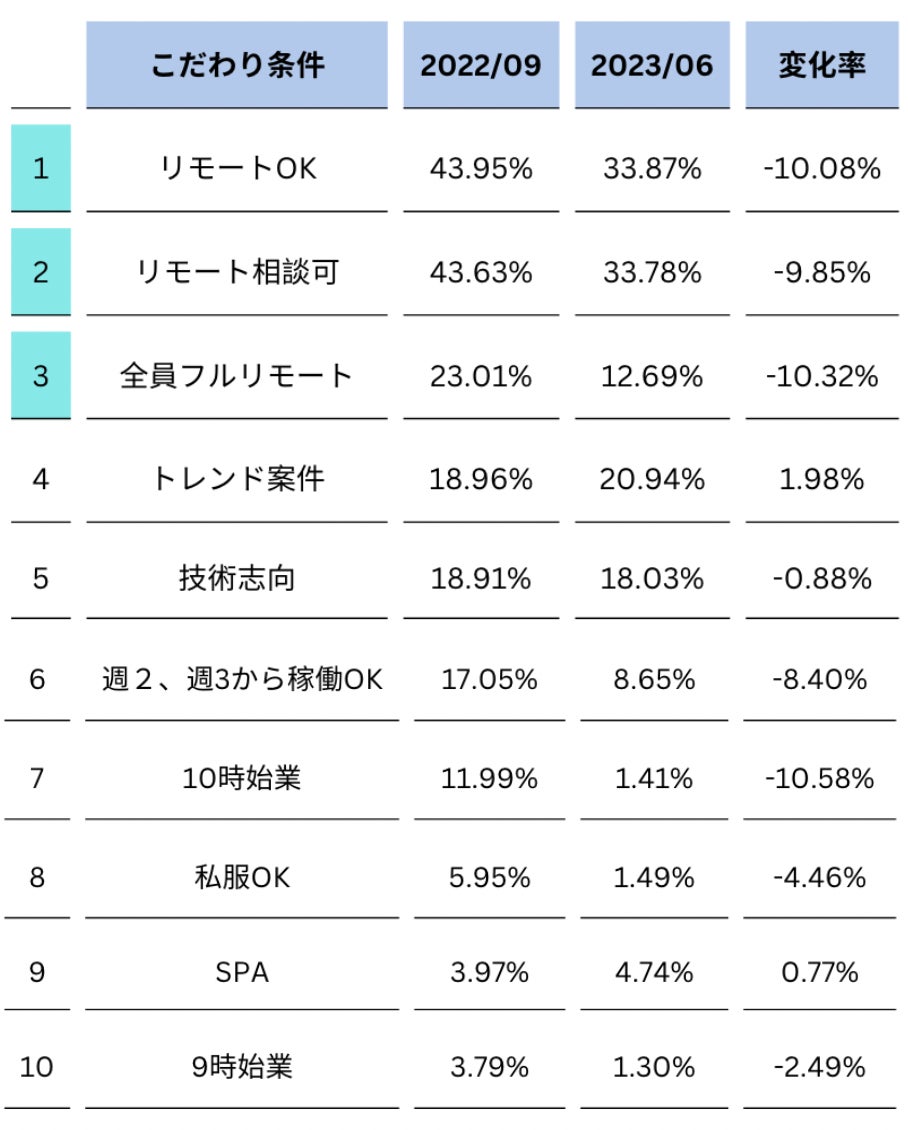 また、当社が調査を始めた2022年の9月の「案件のこだわり条件上位10位」と比較すると、2023年6月は、「リモートワークOK」、「リモートワーク相談可」「全員フルリモート」の案件の割合が9〜10%減少しています。また、それらについで、「週2、週3から稼働OK」、「10時始業」の割合も8〜10%減少しており、始業時間や稼働日数へのこだわり意識は薄れている傾向が読み取れます。