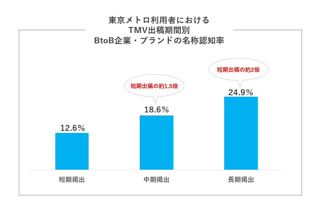 東京メトロ利用者においては、短期(12.6%)、中期(18.6%)、長期(24.9%)と、掲出期間が長い企業ほど認知率が高くなる傾向が確認されました。