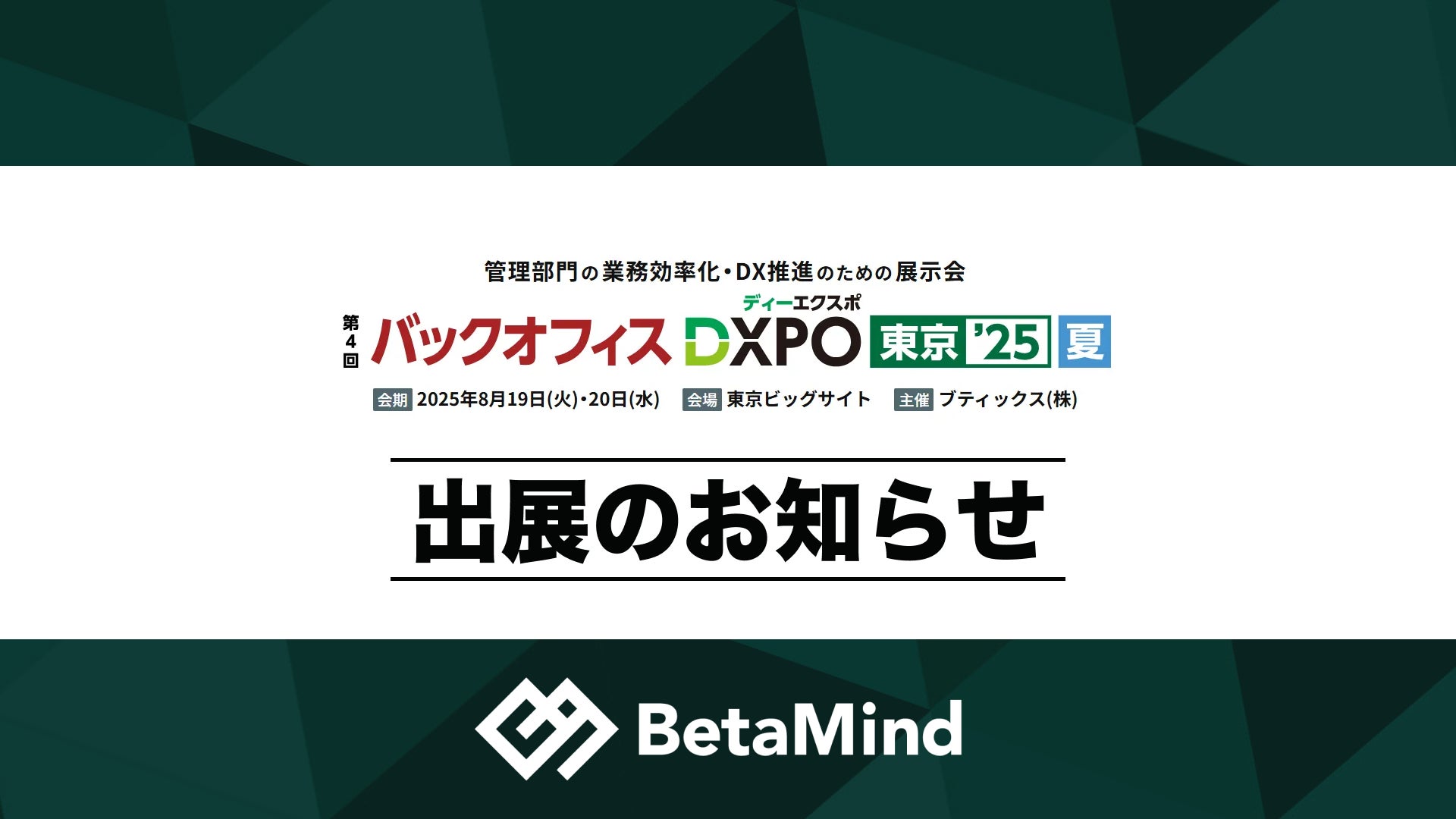 株式会社BetaMind(本社:東京都渋谷区、代表取締役:吉田健人、以下BetaMind)は、2025年8月19日(火)〜20日(水)に東京ビッグサイトで開催される「バックオフィスDXPO東京’25【夏】」へ出展することをお知らせいたします。