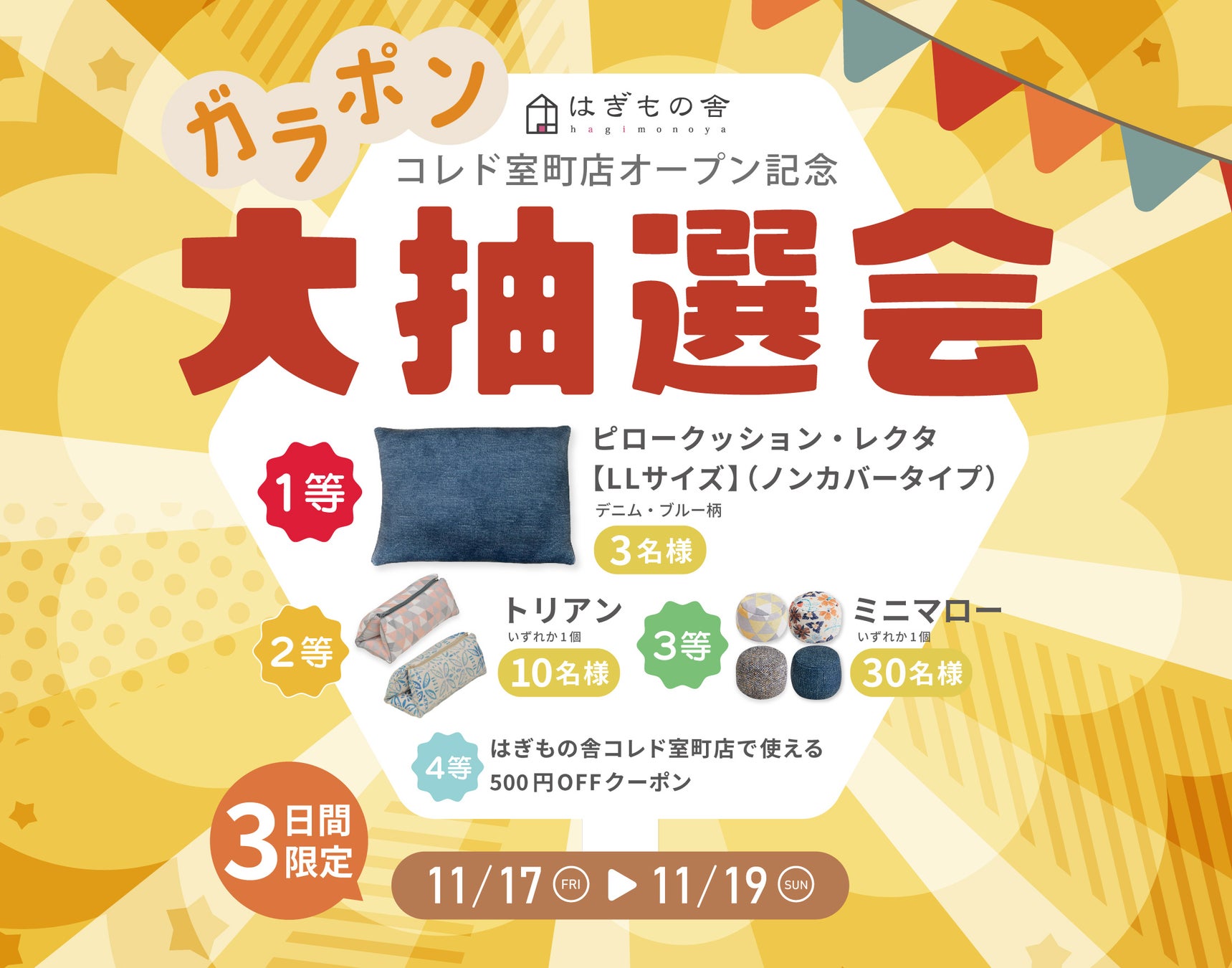 「はぎもの舎(はぎものや)」は、コレド室町3の3階に、新店舗をオープンいたします。オープン記念として、期間中2,000円(税込)以上お買い上げいただいた方に先着でオリジナルエコバッグをプレゼントいたします。さらに、新商品のお披露目と、アプリ会員様なら誰でも参加出来る「ガラポン大抽選会」も開催いたします。ふわもちな心地よさをご体感しに、ぜひお気軽にお越しくださいませ。