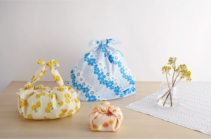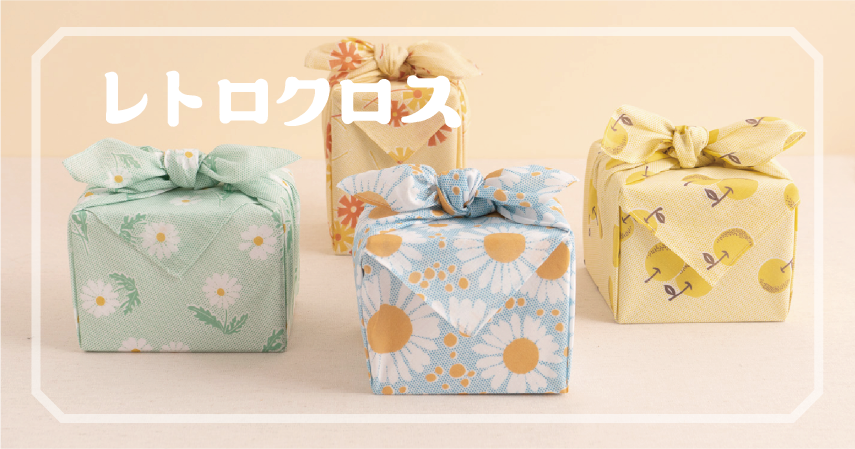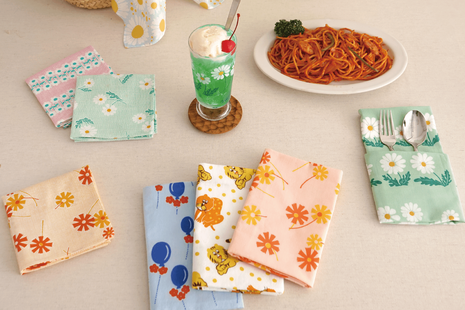 レトロ印刷をイメージした風合いとやわらかな肌触りが特徴で、お弁当やハンカチとして使える50cm角とテーブルクロスや風呂敷バッグとして使える100㎝角が登場しました。繰り返し使えるサステナブルなアイテムとして活躍してくれます。