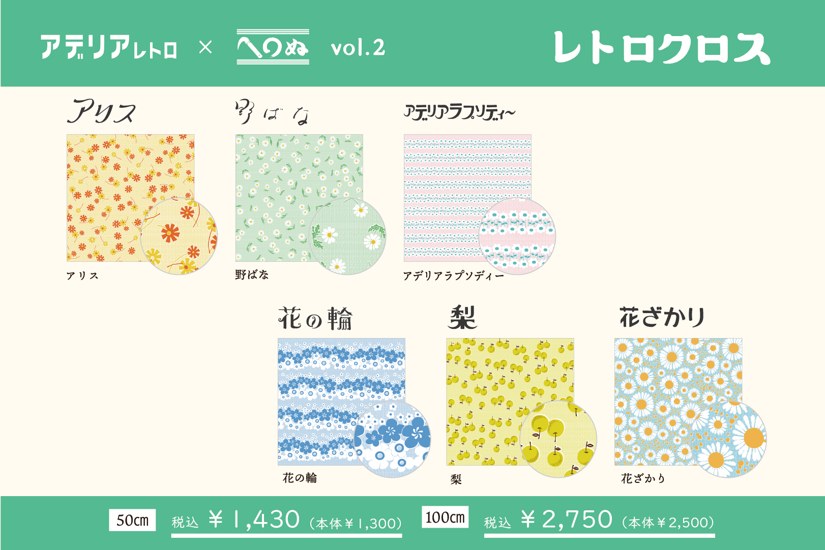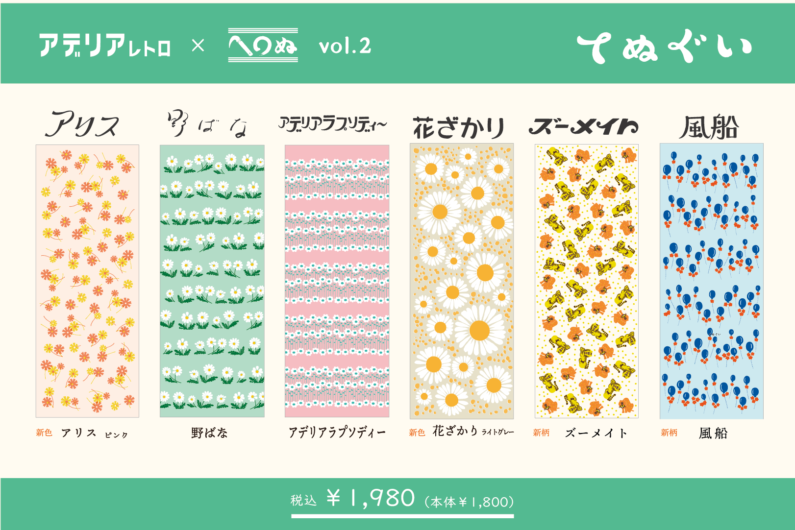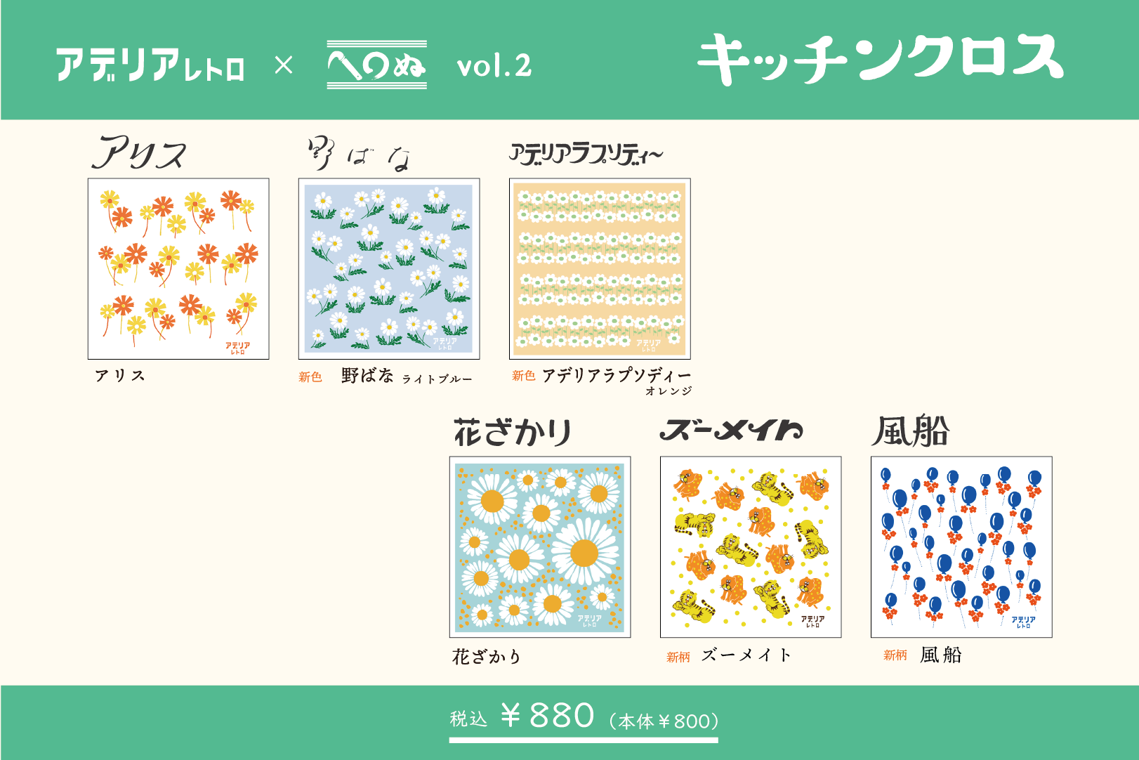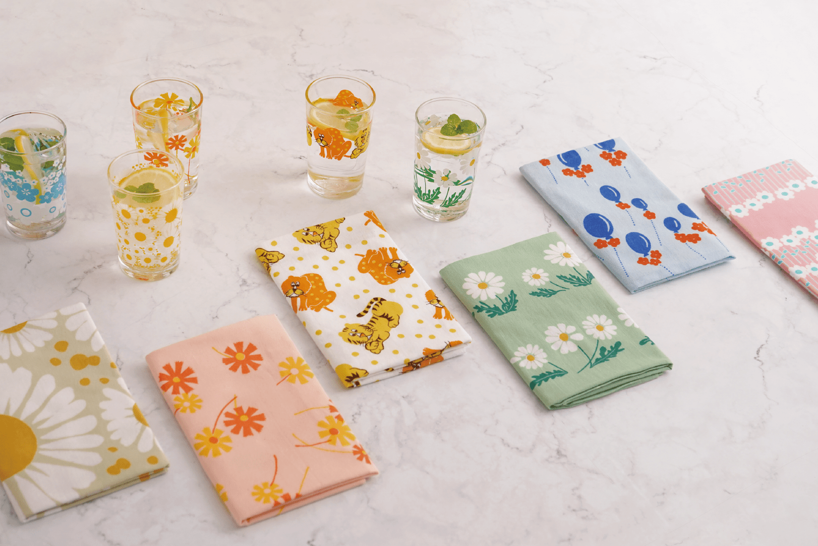 「アデリアレトロ」とは、親しみやすいデザインにより昭和の家庭で人気を集めたアデリアのグラスウェアを、現代でも使いやすいようにリメイクした製品。昨今のレトロブームの火付け役ともなり、幅広い年代の層に愛されているデザインを、かまわぬはてぬぐい、レトロクロス、かや生地キッチンクロスに落とし込みました。また、今回は第1弾でリクエストの多かった「ズーメイト」や「風船」のパターンが新たに登場する他、風呂敷としても使える「レトロクロスシリーズ」に新しく100㎝サイズが登場します。