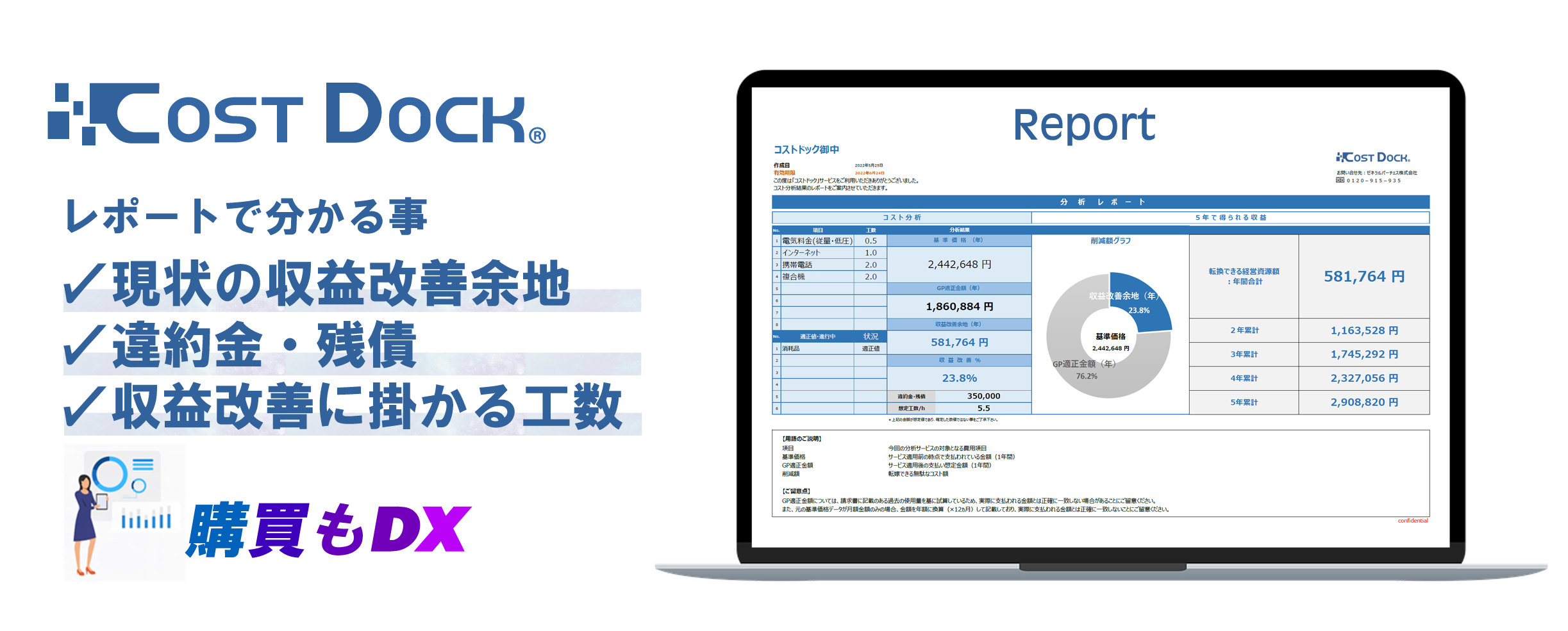 分析できるのは間接費40項目です。サプライヤ切替えをしてもサービスの質が担保できるためその項目に絞っております。今使っている請求をもらえればその価格と、コストドックの最安値の購買価格で比較ができます。