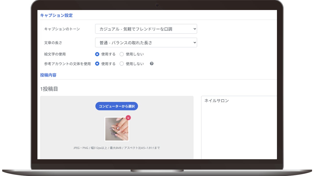 キャプション案や、画像においては、投稿口調の選択(ブランドの世界観に合わせた文体が選択可能)、文量の指定(短文からボリュームある文章まで出力が可能)、キャッチコピー自動提案(配置と画像メッセージを一括生成)などの機能を備えています。