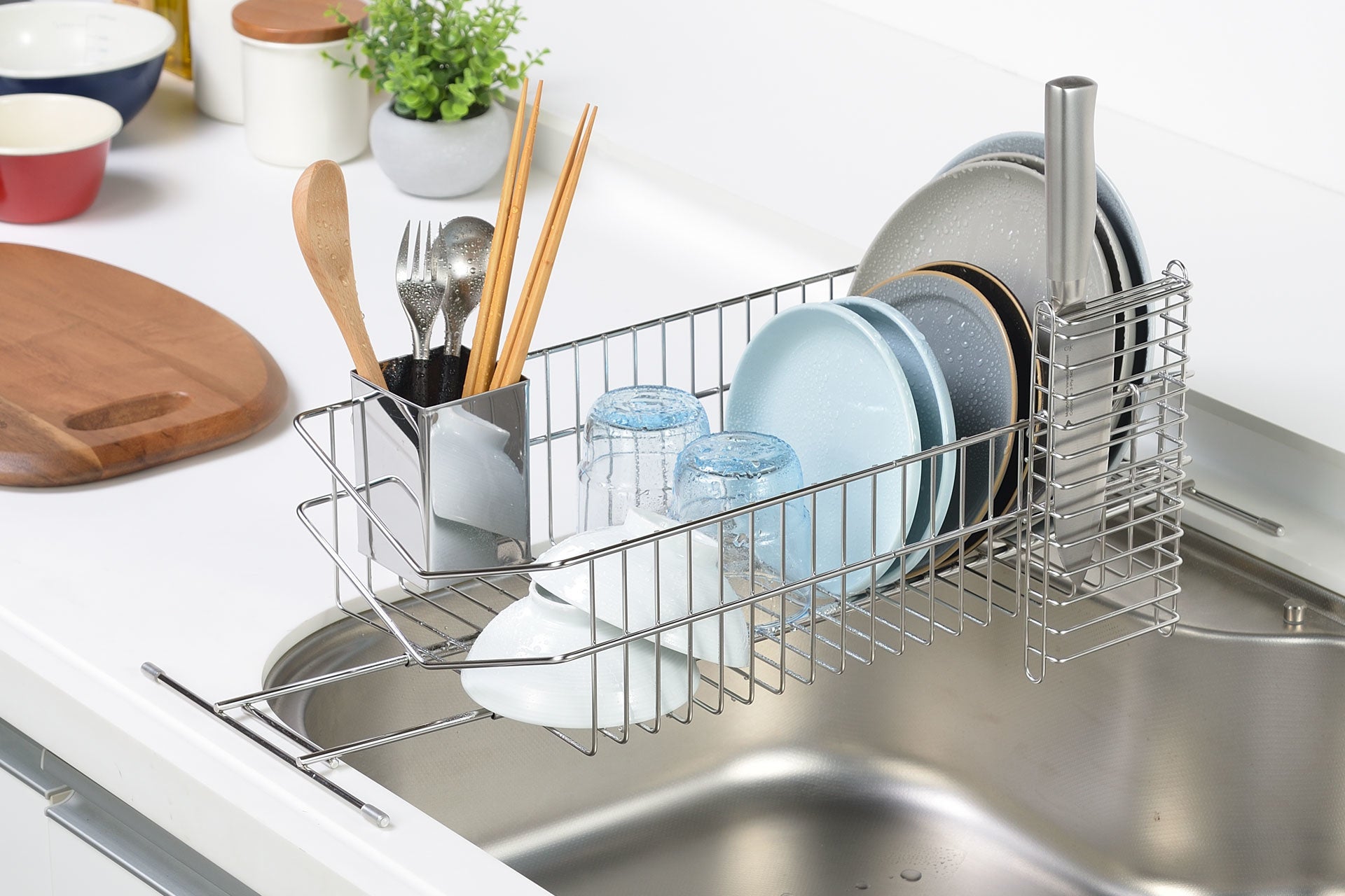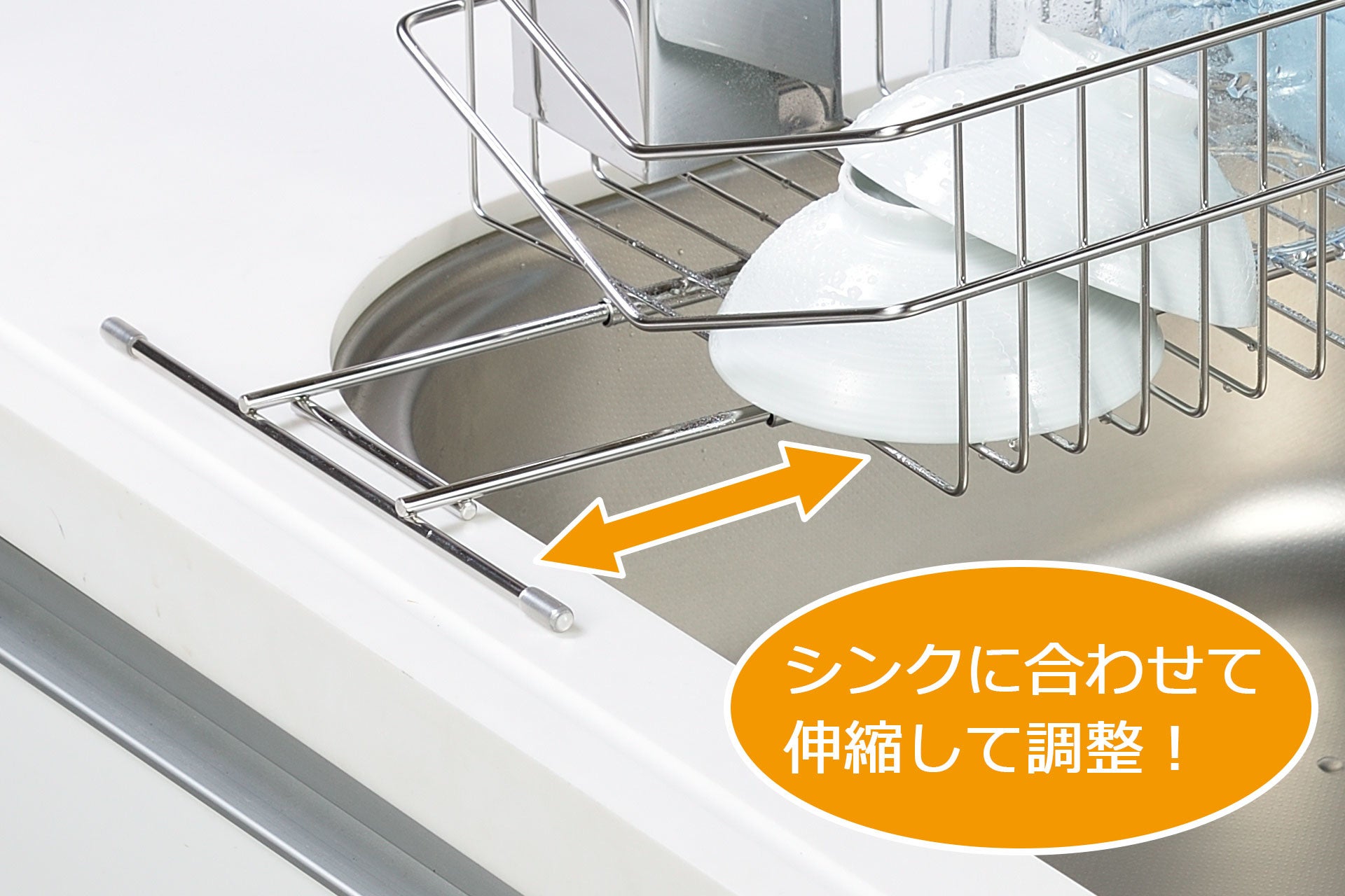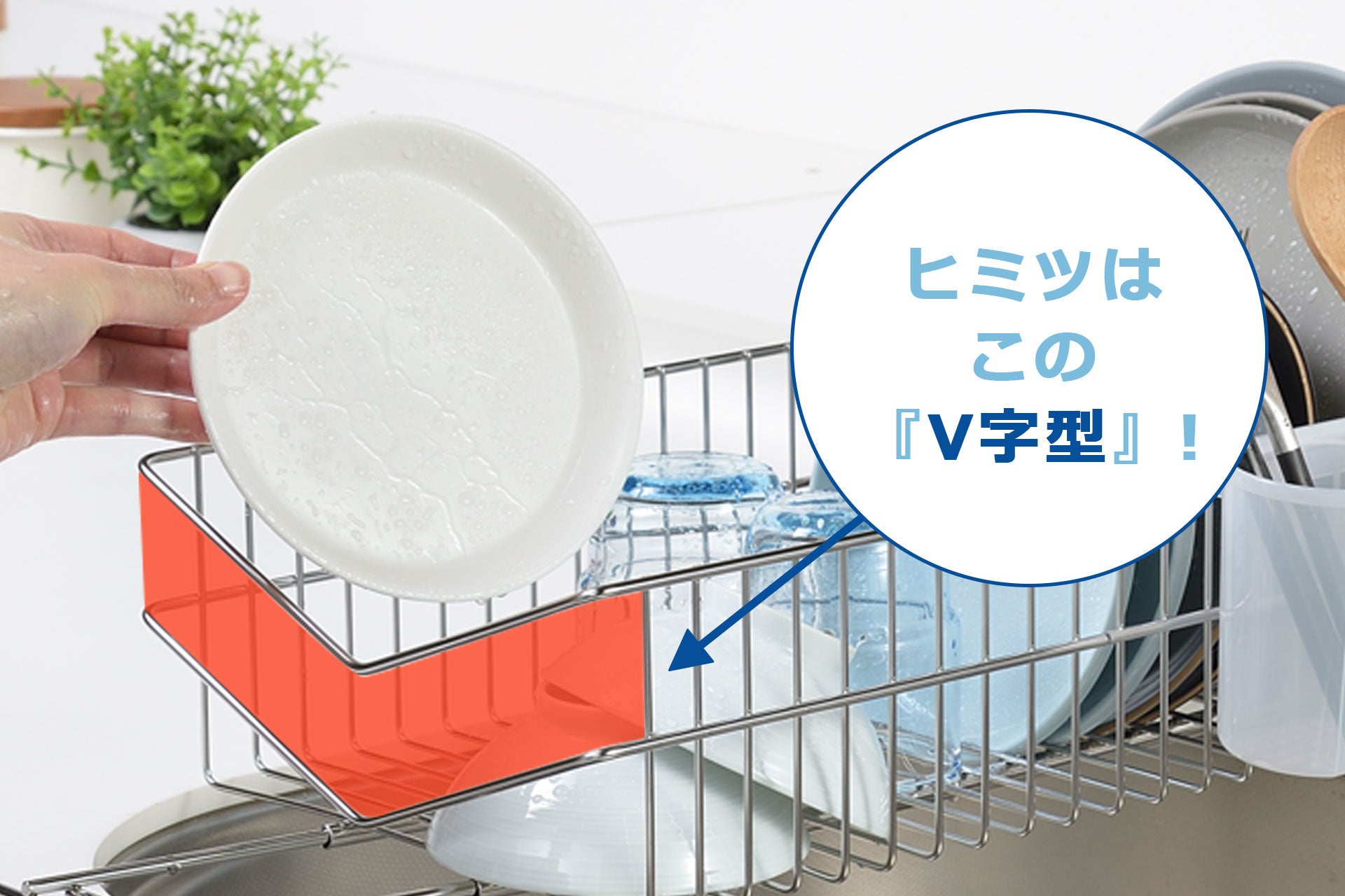 伸縮アーム機能 + 水がシンクに落ちて水捨て不要!シンクを渡せて省スペースな「V字型シンク渡し水切りラックDX」
