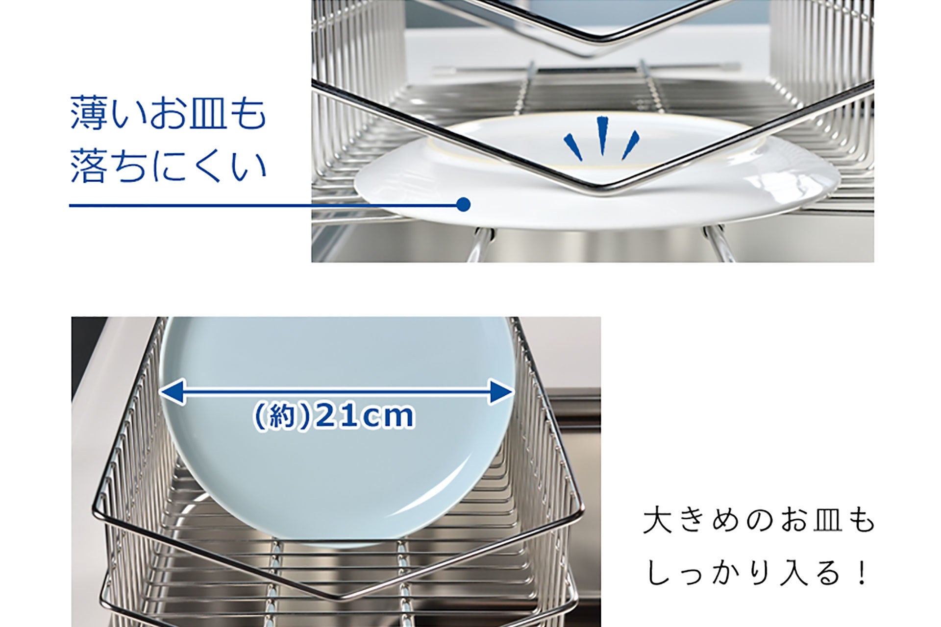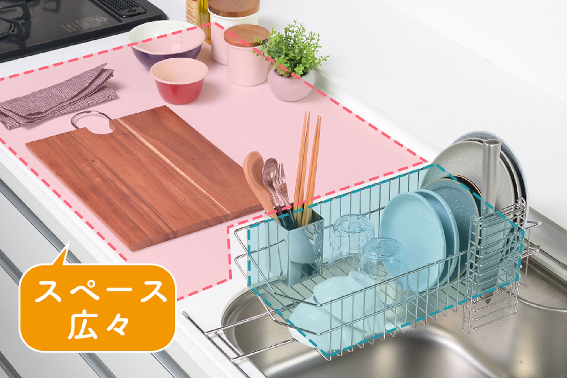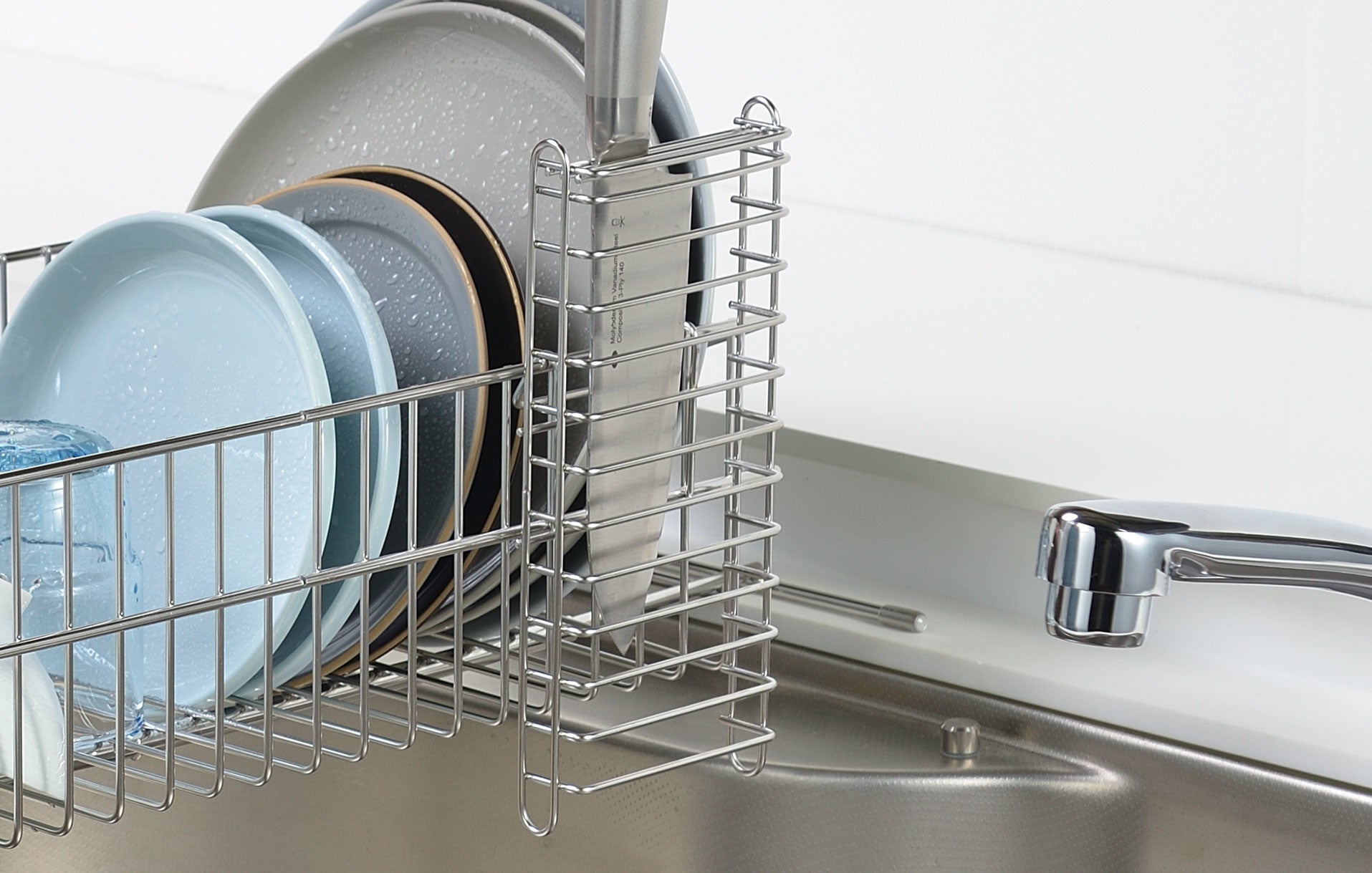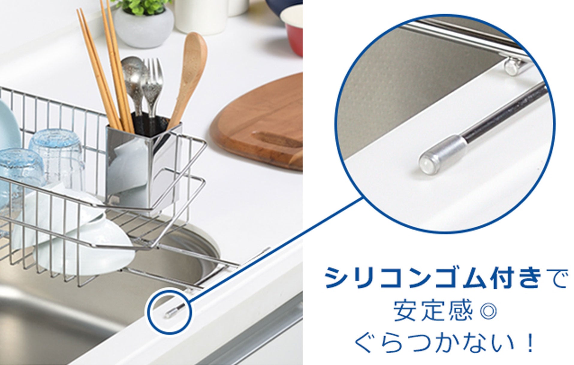 伸縮アーム機能 + 水がシンクに落ちて水捨て不要!シンクを渡せて省スペースな「V字型シンク渡し水切りラックDX」