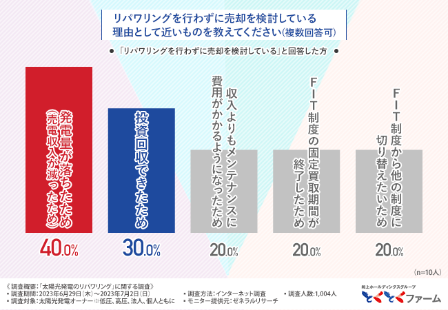 先ほどの質問で、「リパワリングを行わずに売却を検討している」と回答した方(10人)に、「リパワリングを行わずに売却を検討している理由として近いものを教えてください(複数回答可)」と質問したところ、『発電量が落ちたため(売電収入が減ったため)(40.0%)』と回答した方が最も多く、次いで『投資回収できたため(30.0%)』『収入よりもメンテナンスに費用がかかるようになったため(20.0%)』『FIT制度の固定買取期間が終了したため(20.0%)』『FIT制度から他の制度に切り替えたいため(20.0%)』と続きました。