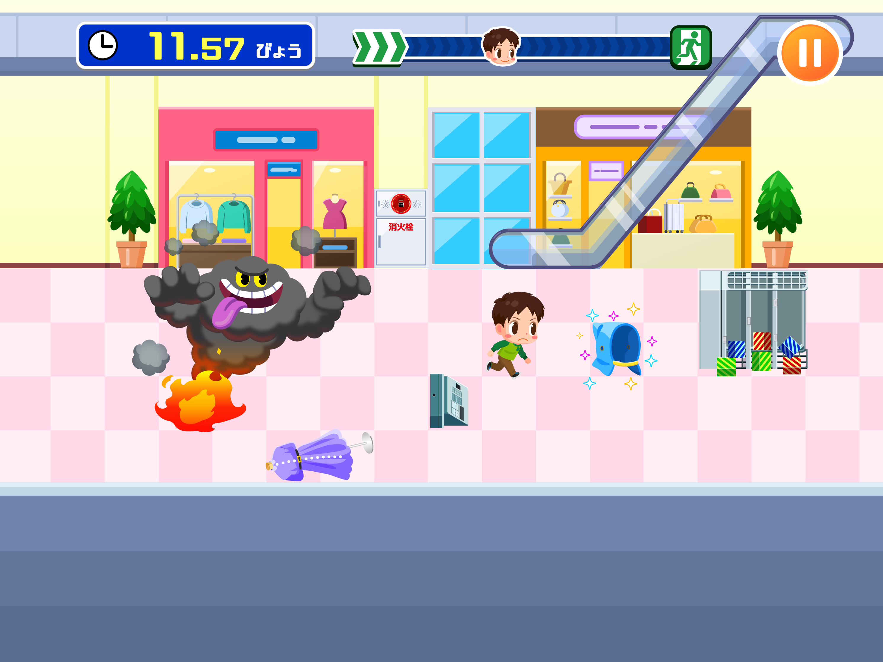 地震、そして火災が発生した建物で、追いかけてくる煙の敵キャラクターに追いつかれないように、非常口を目指して避難するゲームです。