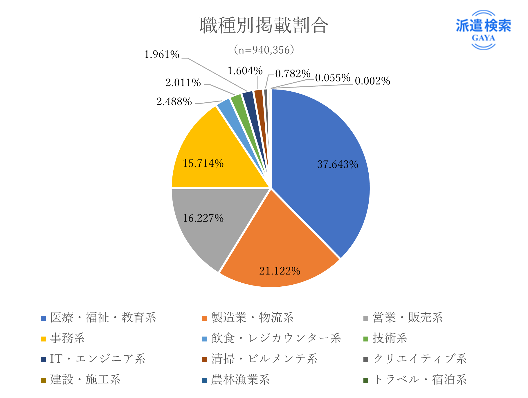 GAYA掲載派遣求人のうち最も多い職種は「医療・福祉・教育系」の38%でした。続いて製造業・物流系21%、営業・販売系、事務系16%、事務系16%と 上記4職種で全体の91%以を占める結果となりました。職種単体の掲載件数でみると介護・福祉246,337件、梱包・仕分け・検品116,757件、一般事務108,064の求人が多く掲載されています。9月に引き続き介護や物流現場での人手不足は継続しているようです。