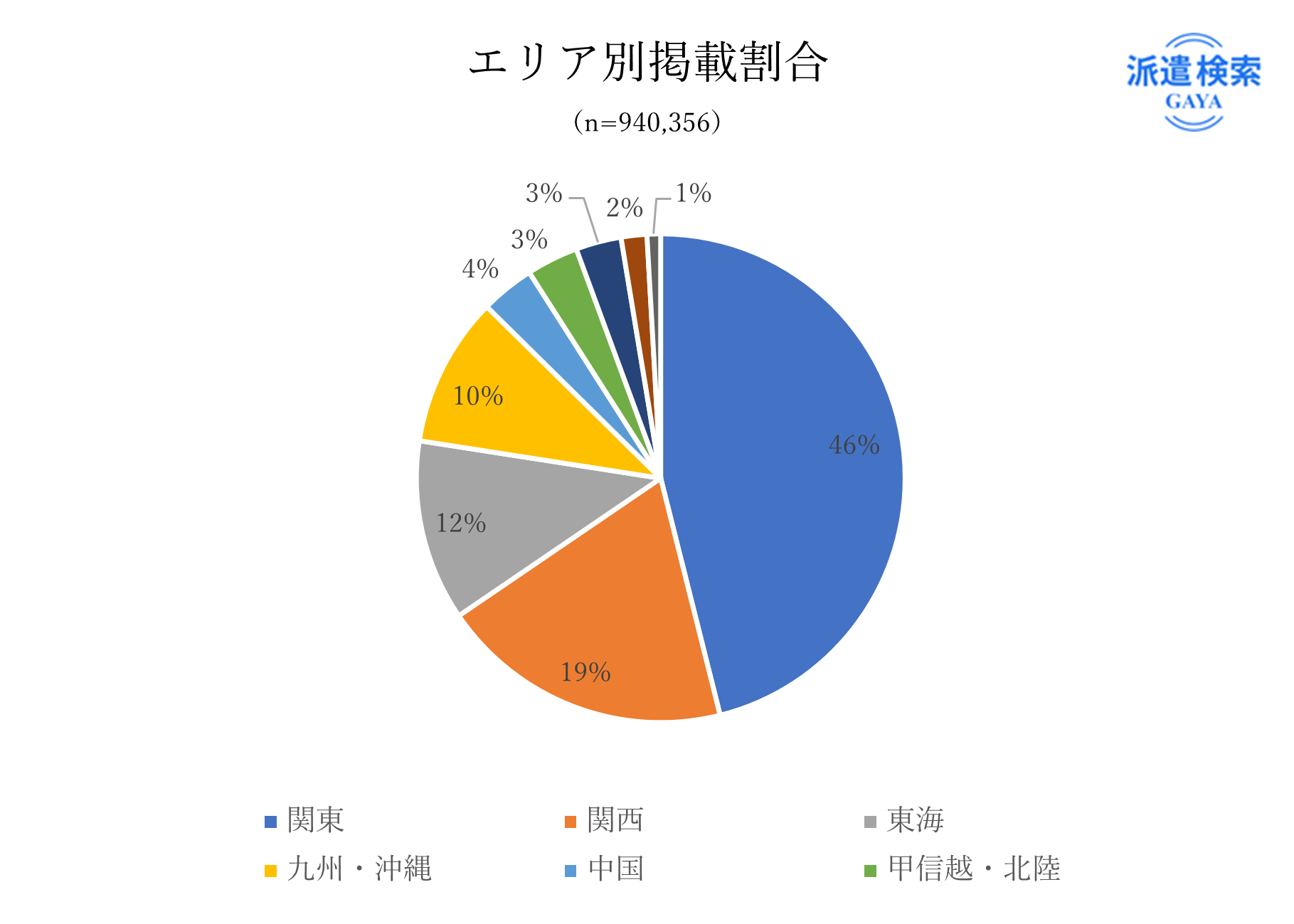 GAYA10月エリア別掲載件数は関東が46%と半分近くを占め、関西19%、東海12%という結果になりました。また、全体の掲載件数では9月度の937,248件を3,108件上回る940,356件と求人数は増加傾向です。