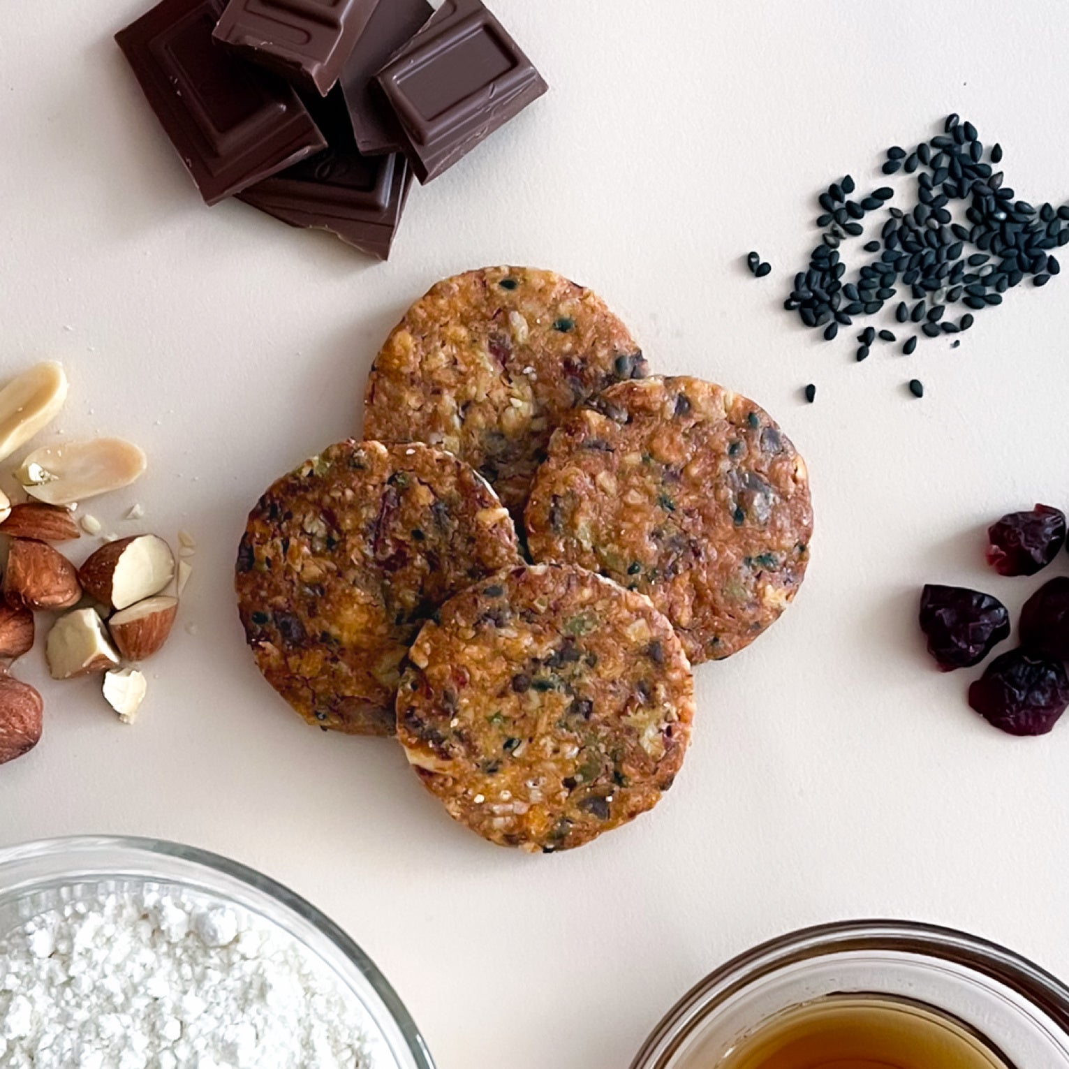 タンパク質やマグネシウムなど栄養価豊富なピーナッツバターをベースに、ピーナッツ、ピーカンナッツ、かぼちゃの種、クランベリーなどのヘルシー食材が詰まったクッキー。