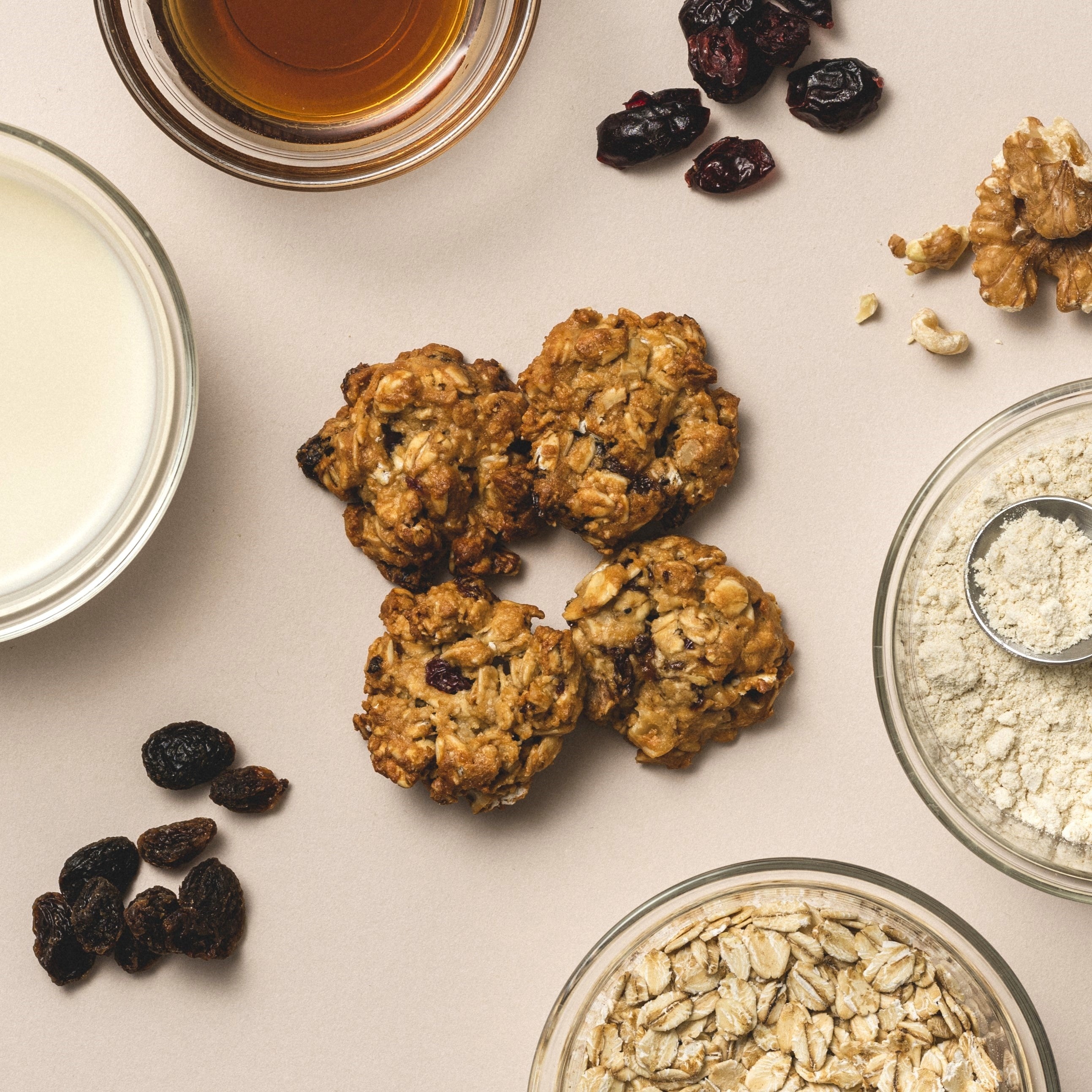 食物繊維豊富な「オートミール」をベースに、ビタミンB6やマグネシウムが豊富な「クルミ」や「クランベリー」をたっぷり混ぜた、食べ応え抜群のクッキー。
