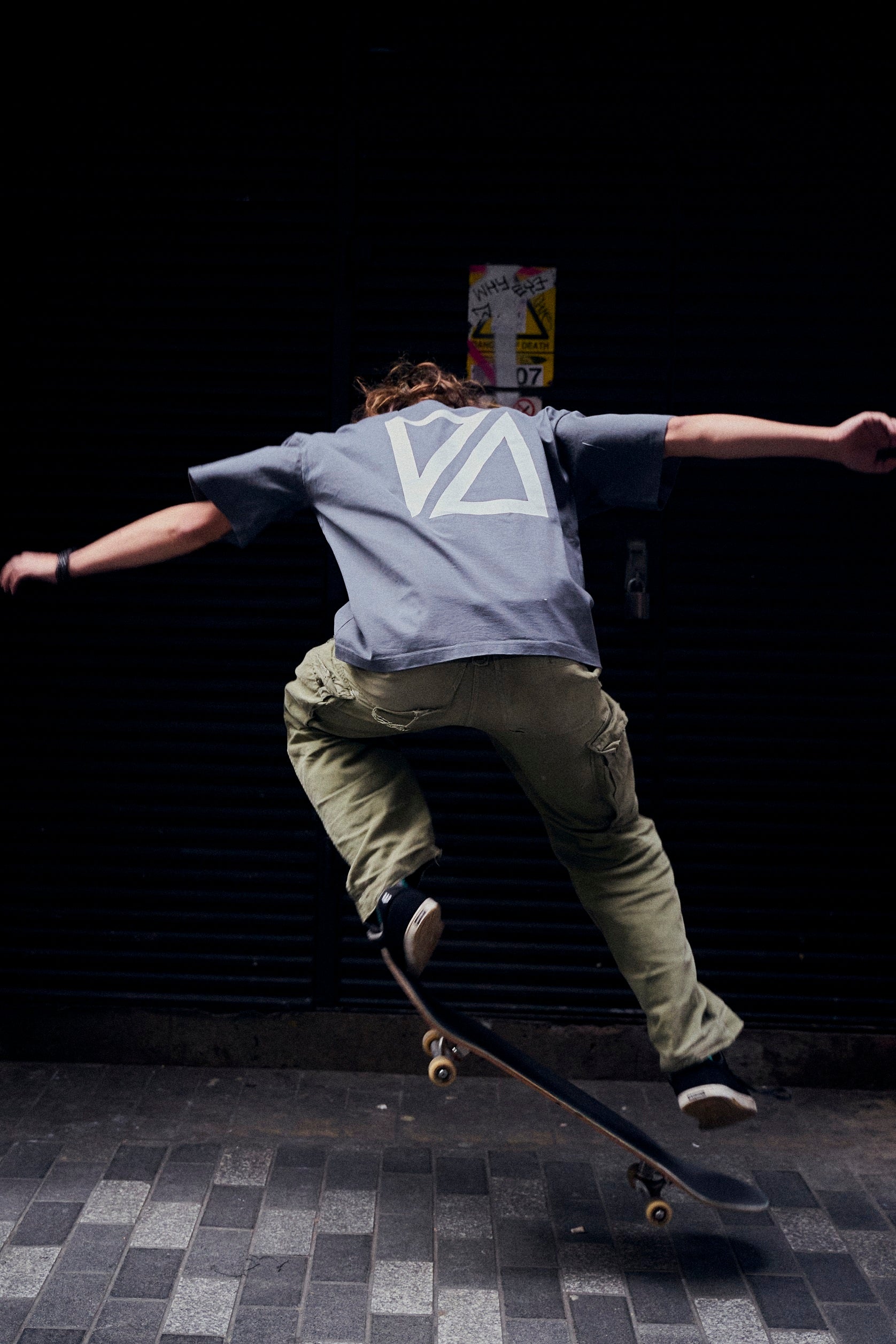 ドロップショルダーでオーバーサイズ。バックにブランドロゴがクラックプリントされた肌触りのよいヘビーウェイトのモックネックTEE。