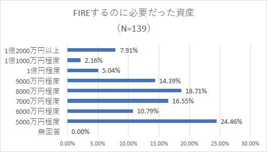 ところが、設問2ですでにFIRE、またはサイドFIREしたと答えた139人に<設問4:FIREするのにどれくらいの資産が必要でしたか?>と質問したところ、「5000万円」が24.46%で最多。1億円以上としたのは15.11%にとどまりました。
