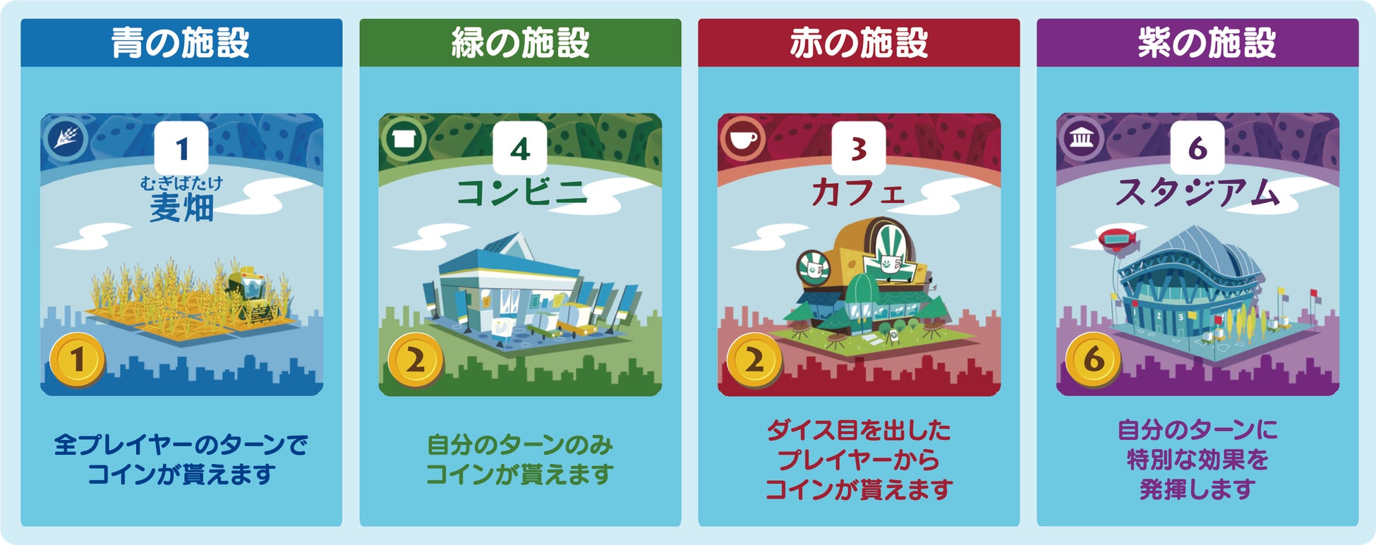 同じ施設を複数集めコンボで一発逆転を狙う、様々な施設を集めてコイン獲得の機会を増やす等戦略はいくつかありますが、選択できる施設の数は限られています。