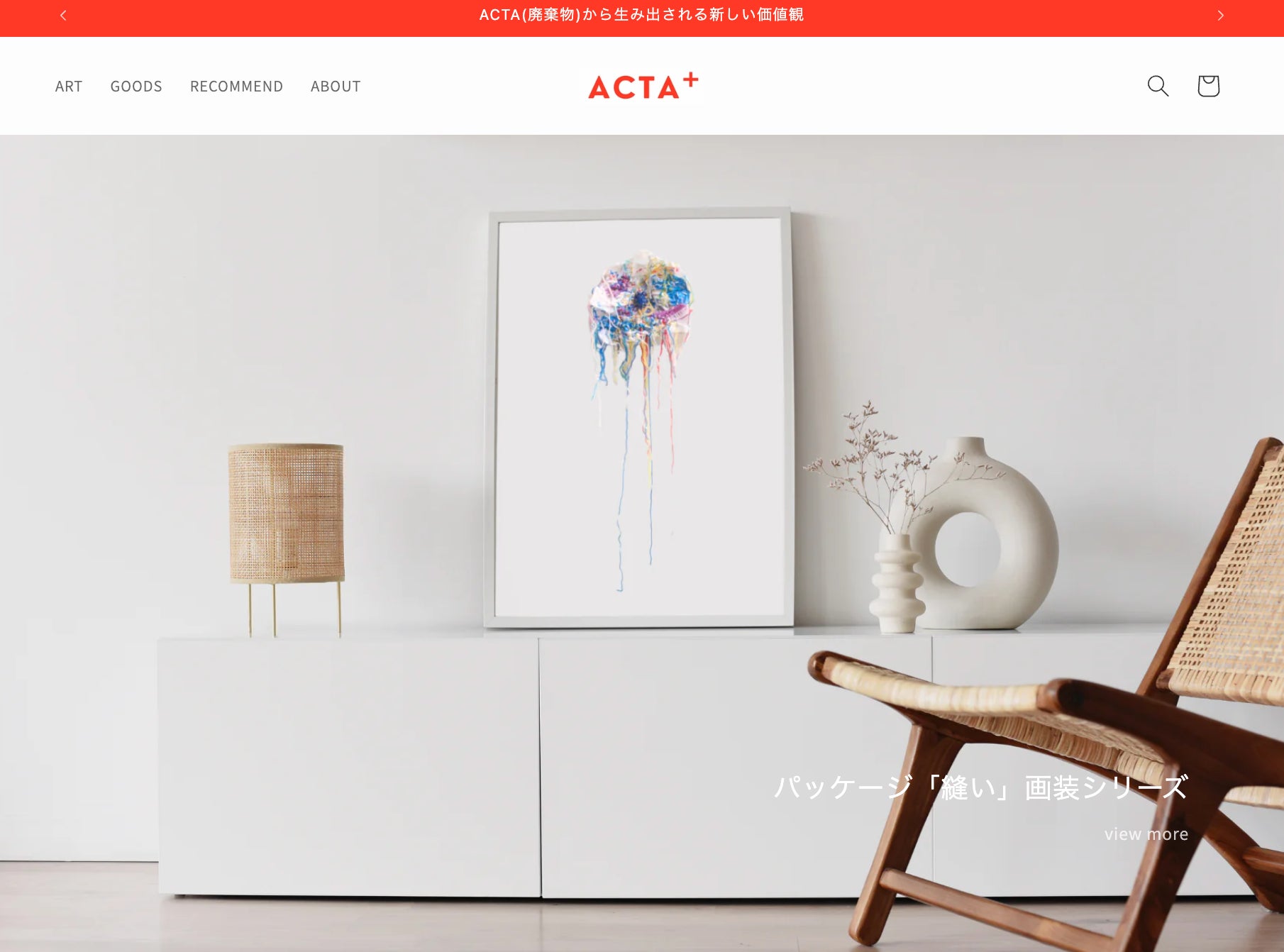 この度「廃棄物から生み出されたアート作品」を気軽に購入できるマーケットプレイス「ACTA+(読み:アクタプラス)」をオープンいたしました。インテリアとして、大切な人への贈り物としてご利用いただけます。