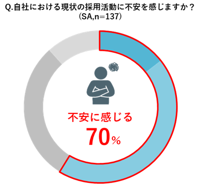採用エキスパートチーム発足に際し、フジ子さんユーザーに向けて「採用活動」におけるアンケート調査を行いました。調査を実施した137社のうち、7割もの企業が自社の採用活動に不安を感じていることが判明。