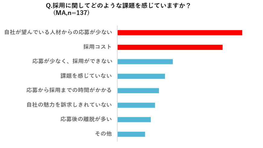また、採用活動の中で抱える不安ゴト1位では「自社が望んでいる人材からの応募が少ない」、次点で「採用コスト」がランクイン。時間、質、コストなどを含めた効率的な採用活動に課題を感じている企業が多いことが分かります。具体的な悩みとしては、「どのような人材にどれくらいの予算を付けるべきかを絞りきれていない」「うまく各スタッフに振り分けられるように整理できていない」など、自社のリソース不足に課題を感じている企業も見受けられました。