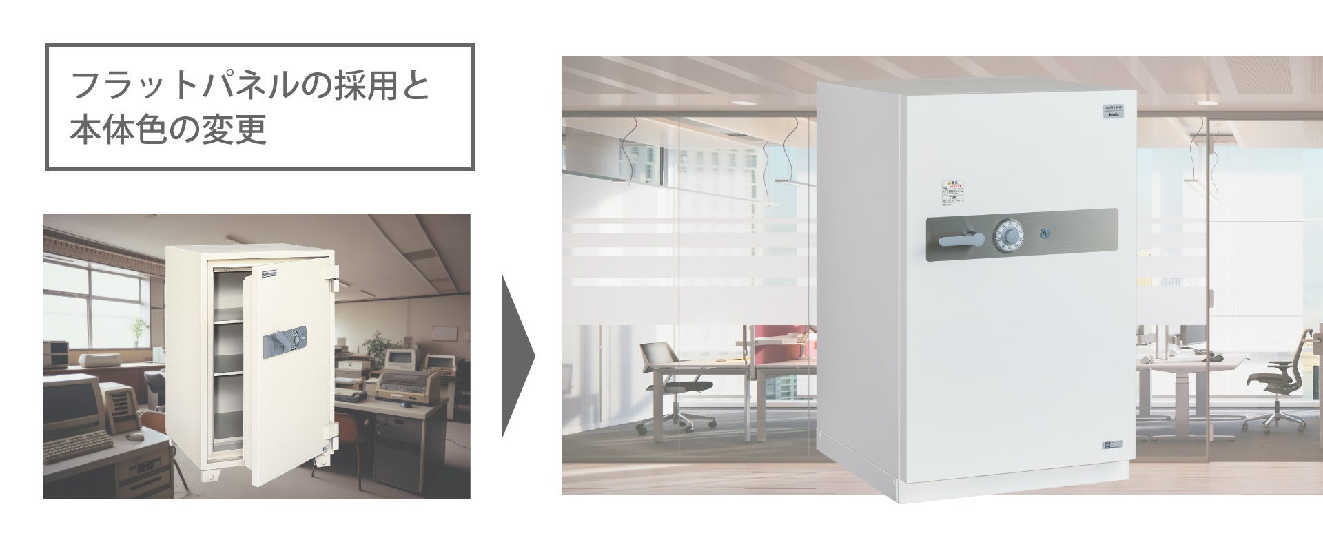 丁番や車輪をカバーで覆うフラットパネルを前面に採用し、余分な陰影を無くすことでスマートな印象を与えます。また、本体色も従来のアイボリーから、現代のオフィス空間に調和するホワイトへ変更しました。