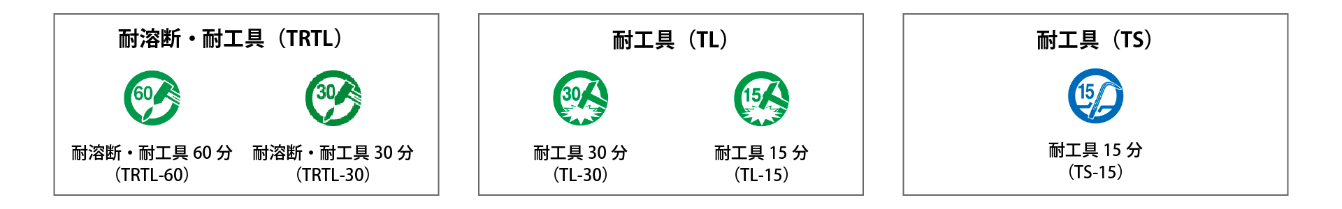 金庫の防盗性能は業界団体である日本セーフ・ファニチュア協同組合連合会によって定められた試験規格に準じて評価されています。アイコン内の数字は耐久時間(分)を表します。