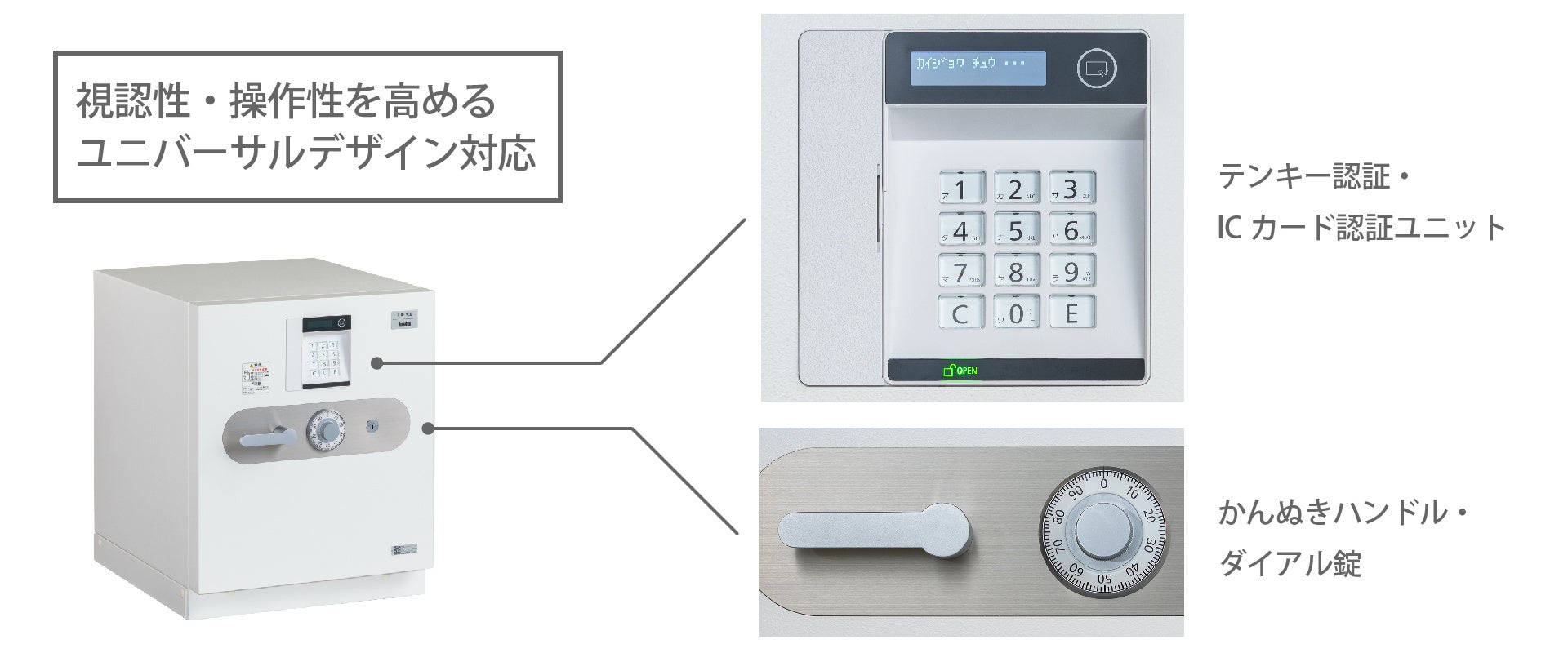 ユニバーサルデザインを考慮したダイアル錠や取手を採用し、従来機種よりも視認性・操作性を向上させました。また、いつ・誰が操作したかの履歴保存機能を備えるテンキー認証・ICカード認証用のユニットも、新たに開発した大型ボタンを搭載しており、標準のダイアル錠よりも快適・便利にご使用いただけます。