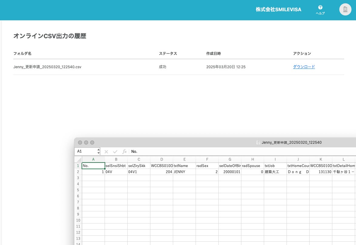 SMILEVISAでは、入管のオンライン申請業務をDX化するために、2024年の夏頃より、オンライン申請システムに対応したCSV出力機能を実装し、現在に至るまで機能の改善を重ねてきました。今回特許を取得した技術・機能の概要は以下の通りです。