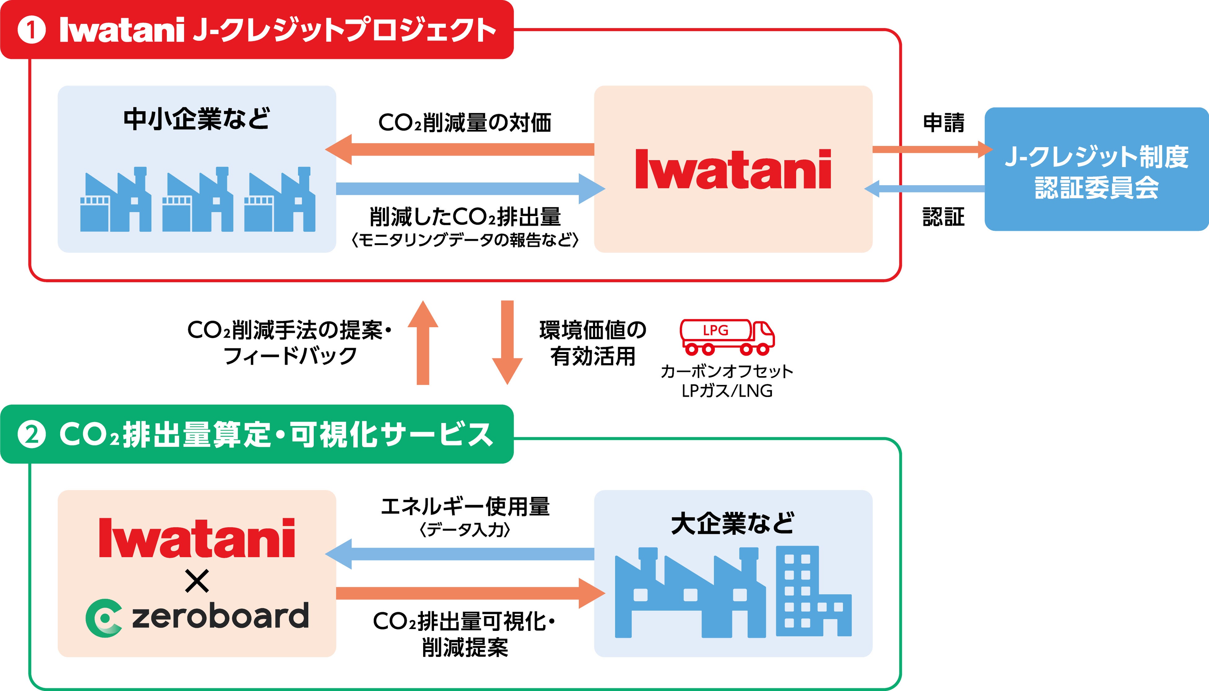 本協業では、岩谷産業の顧客企業を中心に「zeroboard」を利用した脱炭素ソリューションを提供します。具体的には、中小法人顧客の削減CO₂から抽出した環境価値を大企業のCO₂削減に活用するJ-クレジット取引や、製造業顧客を対象としたCO₂排出量の算定作業の簡便化と計画的なCO₂削減ソリューションを提案いたします。
