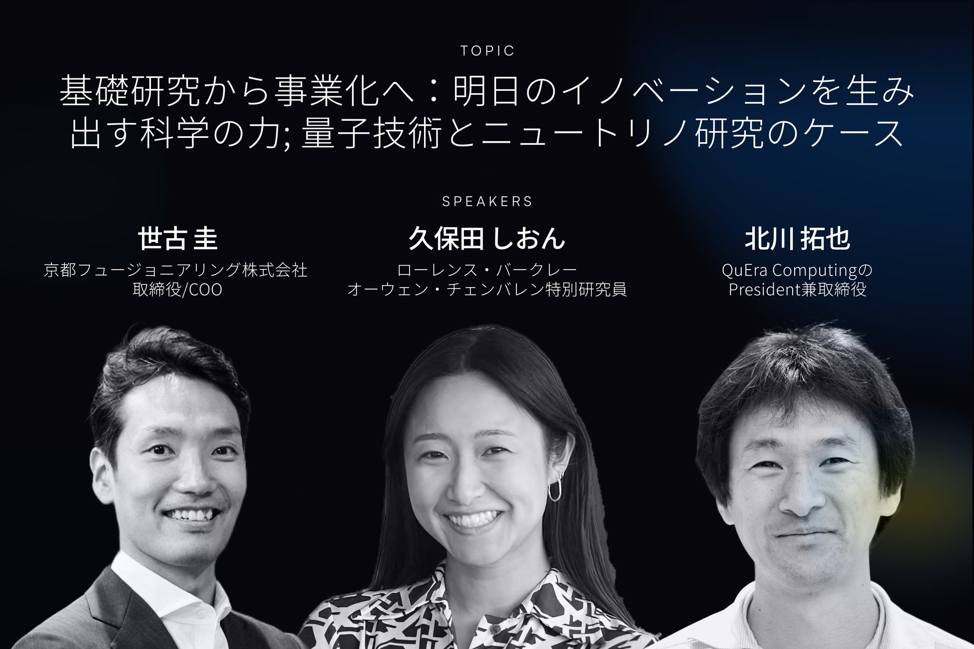 本セッションには、このサミットのために米国から特別に帰国する、世界的な研究者二名が登壇します。冷却原子ベースの量子コンピュータ開発をリードするQuEra Computing Presidentの北川拓也氏と、米国ローレンス・バークレー国立研究所でニュートリノ物理学の最前線を探求する久保田しおん氏です。