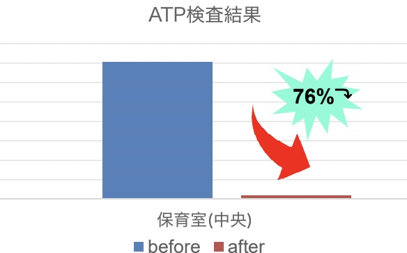 空間に浮遊する菌量の削減や、ウイルス・細菌を除菌してくれるため、導入前と導入後での菌の量を76%※減らすことができました(ATP検査での実績値)。設定したルートに沿って自動運転されるため、人によるムラや“掃除残り“もありません。
