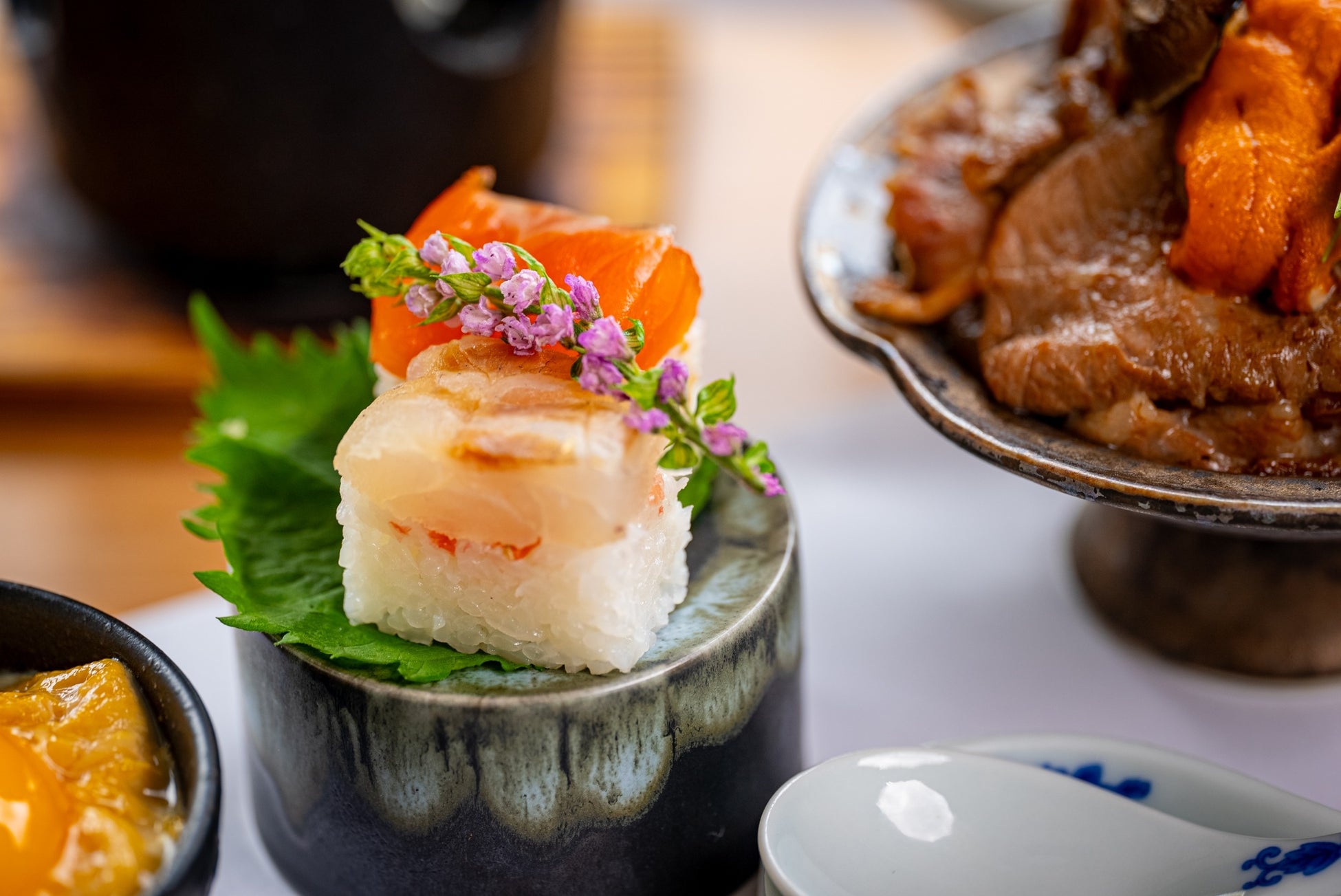 鮮度抜群、国産の鯛と鮭を、丁寧に押し寿司に仕上げました。