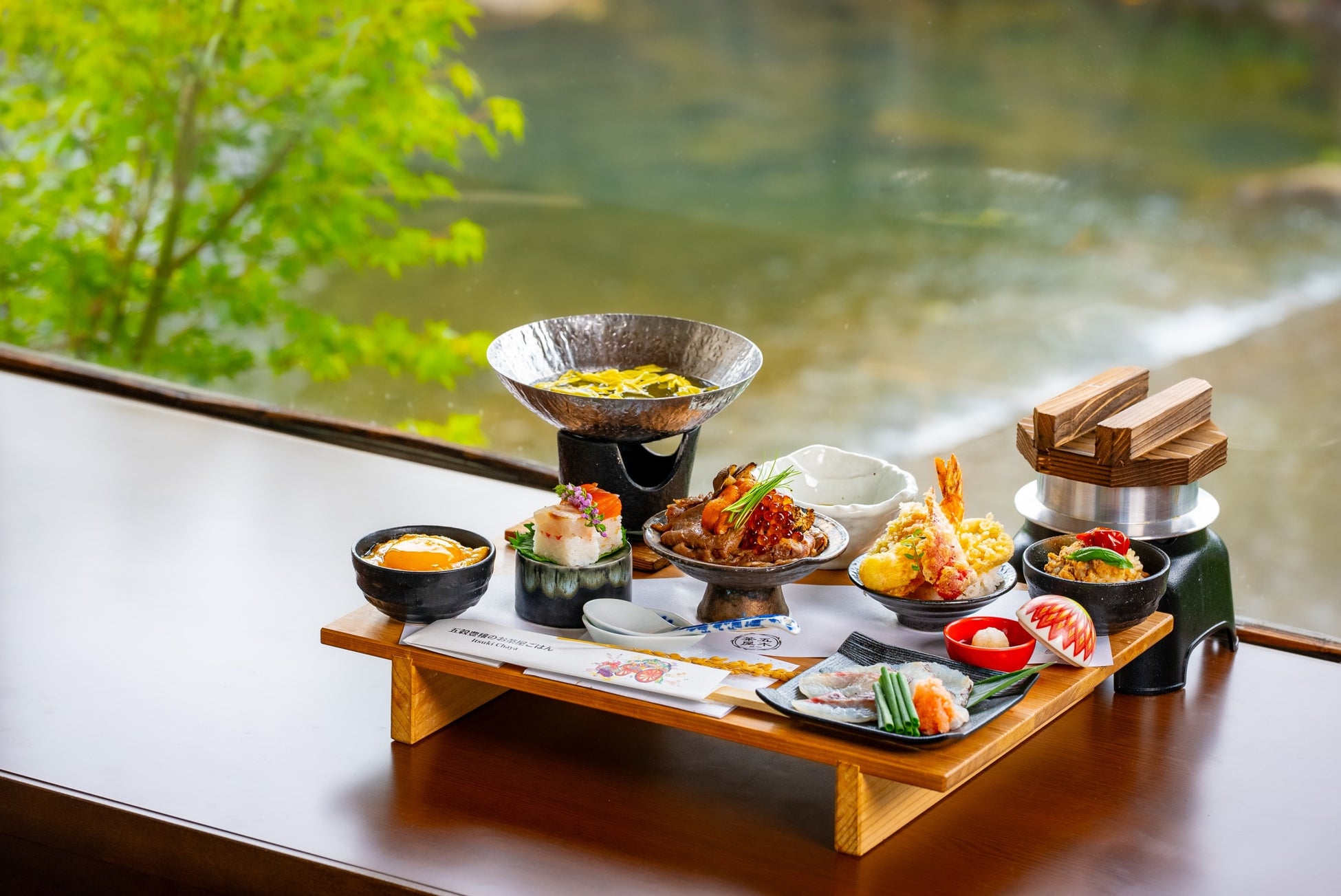 ◼️厳選した秋の味覚を、店内から覗く川庭の風情と共に