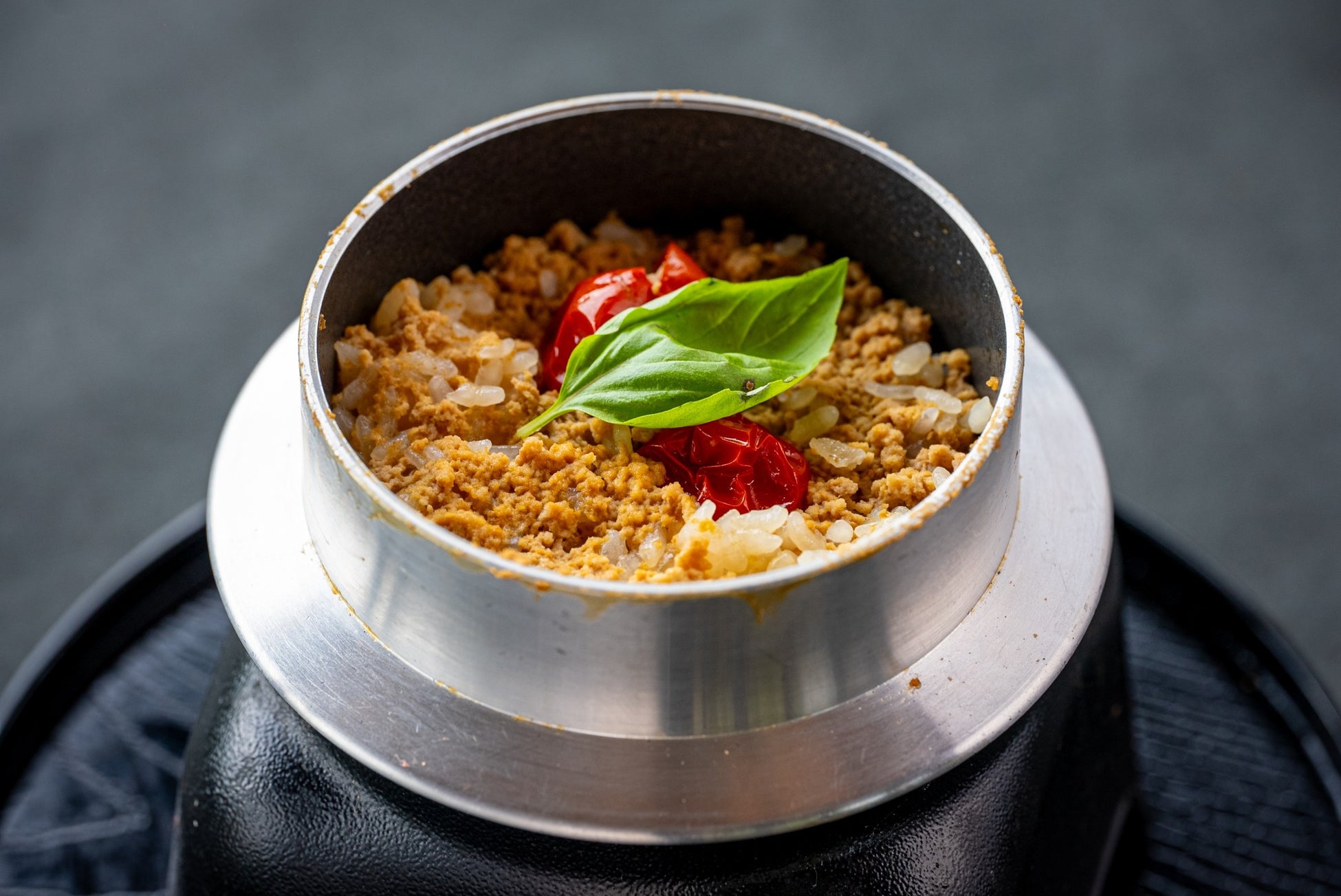 トマトとバジル、そして鴨そぼろを使った新感覚の、洋風釜飯。