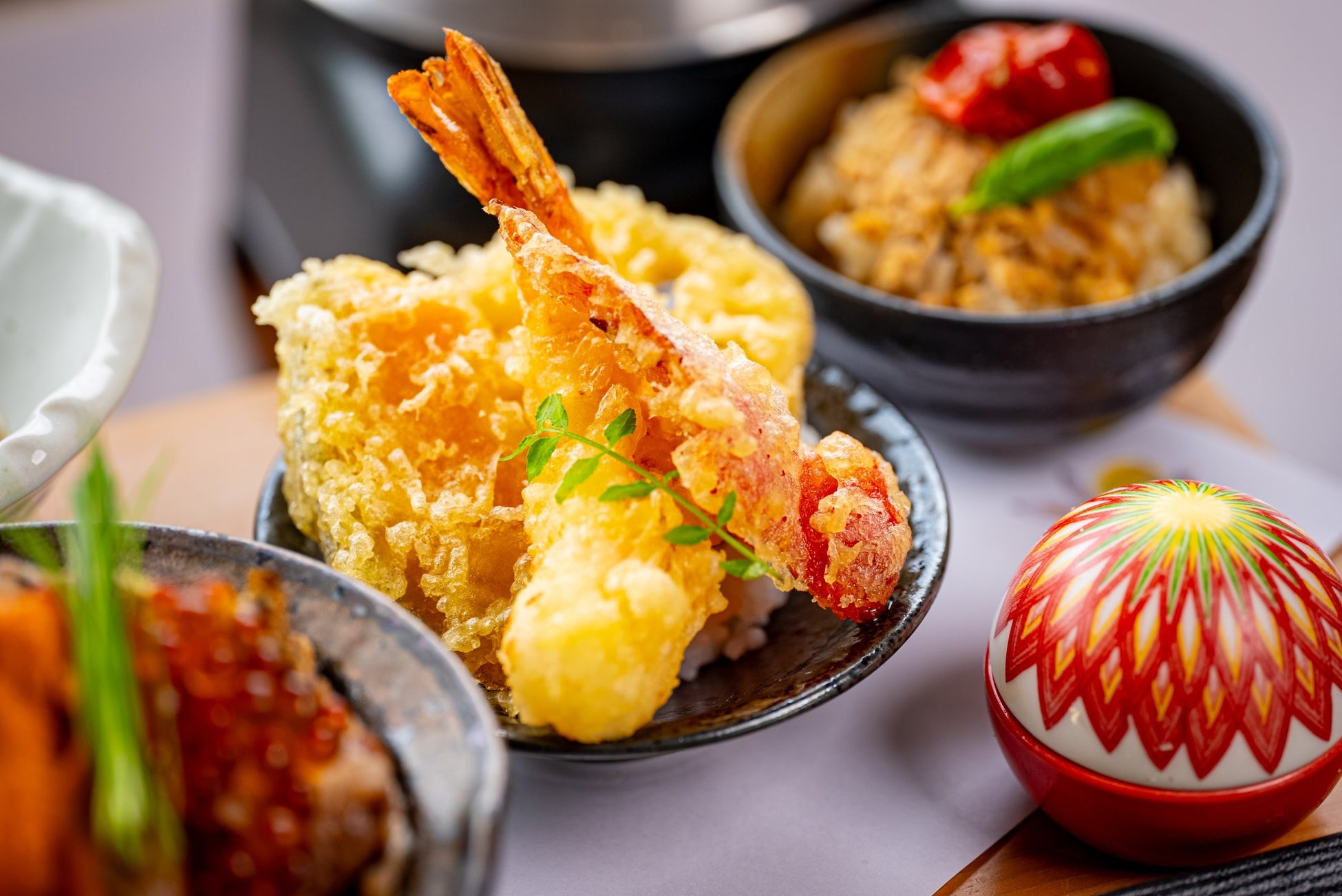 プリプリの海老や旬の京野菜をメインに仕上げた、揚げたて熱々の天丼です。