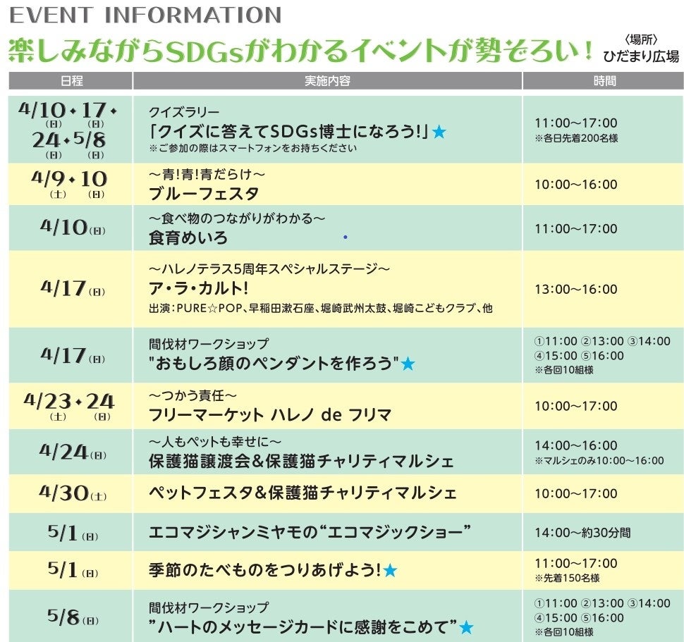 商業施設を運営活動していくなかで、身近で無理なくできるサステナブルな行動にはどのようなことがあるのでしょうか。ハレノテラスでは、周年祭イベントのテーマを「SDGs(持続可能な開発目標)」として、様々なイベントを開催します。楽しみながらSDGsを学ぶことができます。