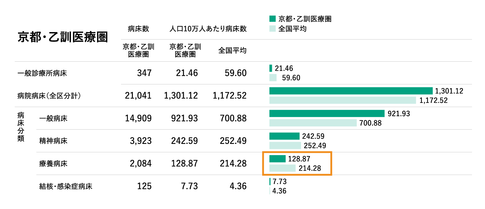 国立社会保障・人口問題研究所によりますと、京都市を含む京都・乙訓医療圏では、2050年にかけて高齢者の割合が増加し続けると推測されています。 2020年の時点では高齢者の割合は、28.2%ですが、2045年推計では36.2%と約8%上がる見込みです(※1)。ところが、同医療圏において長期に療養を必要とする人が入院をする「療養病床」の数は人口10万人あたり128.87と、全国平均の約6割にとどまっていて(※2)、今後、高齢者が充分なケアを受けられる環境が不足していくと考えられます。