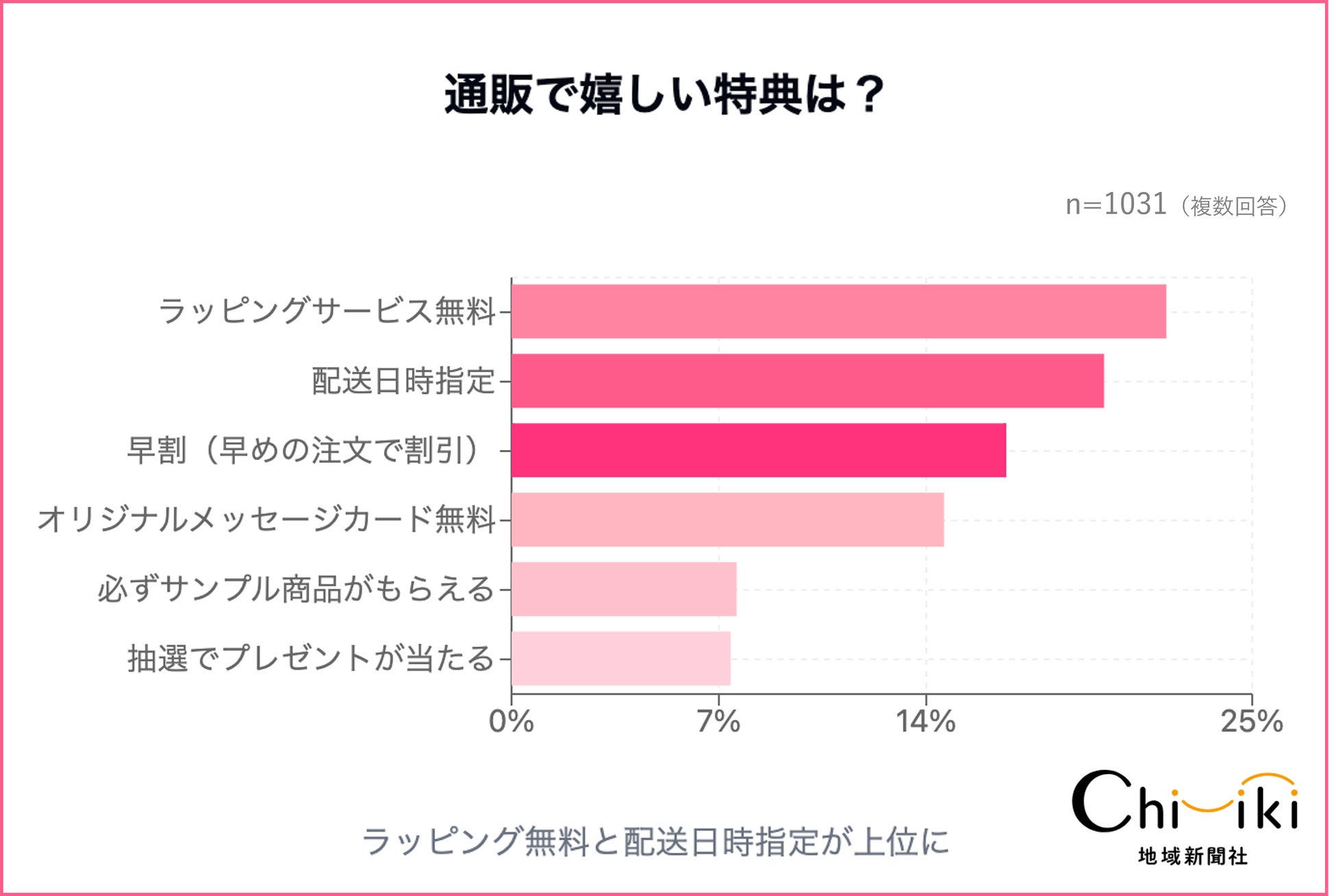 7. 通販で重視される特典トップ3は「ラッピング無料」「配送日時指定」「早割」
