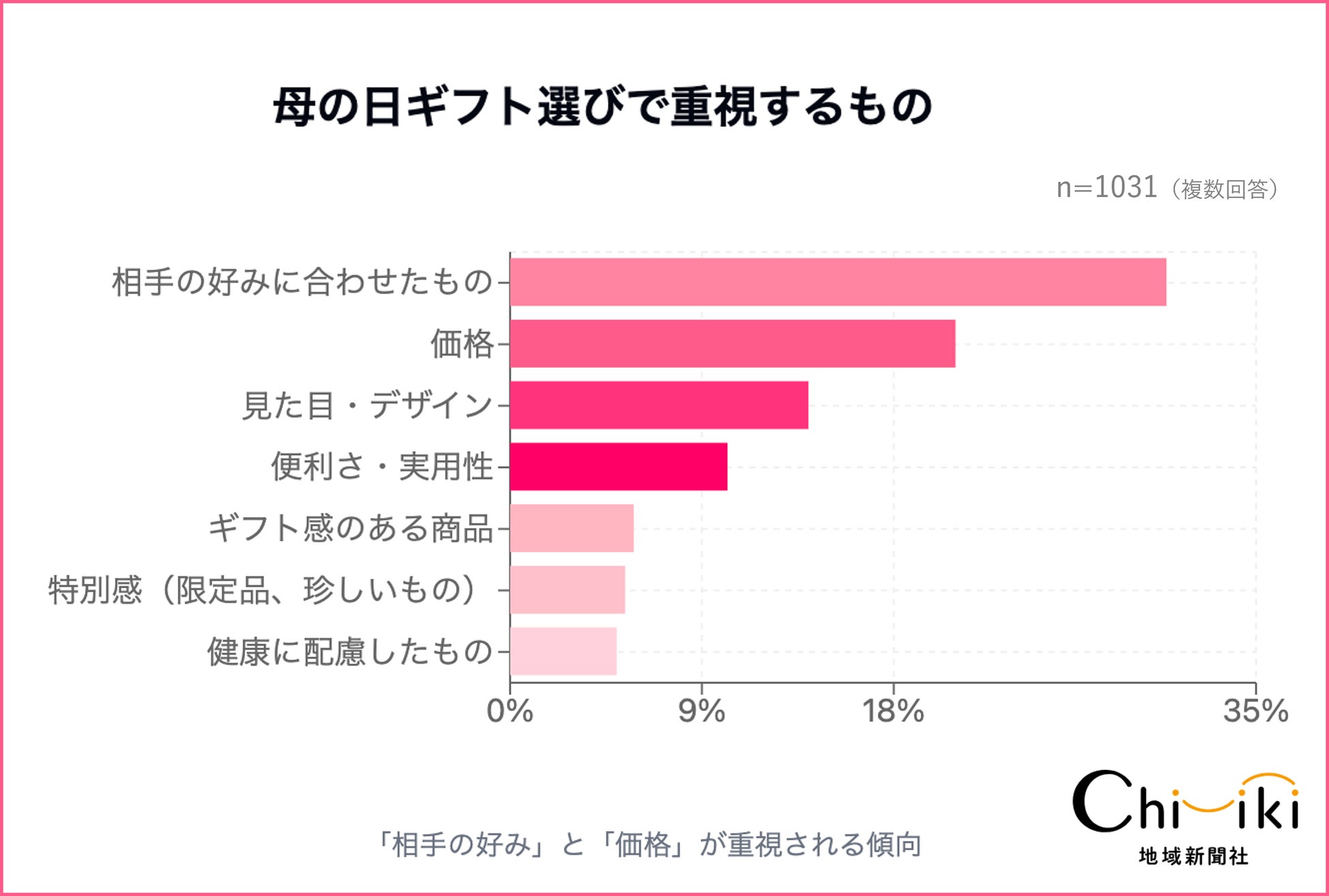 母の日ギフトを選ぶ際に重視する点(複数選択可)については、「相手の好みに合わせたもの」が30.8%で最も高く、次いで「価格」が20.9%、「見た目・デザイン」が14.0%という結果になりました。