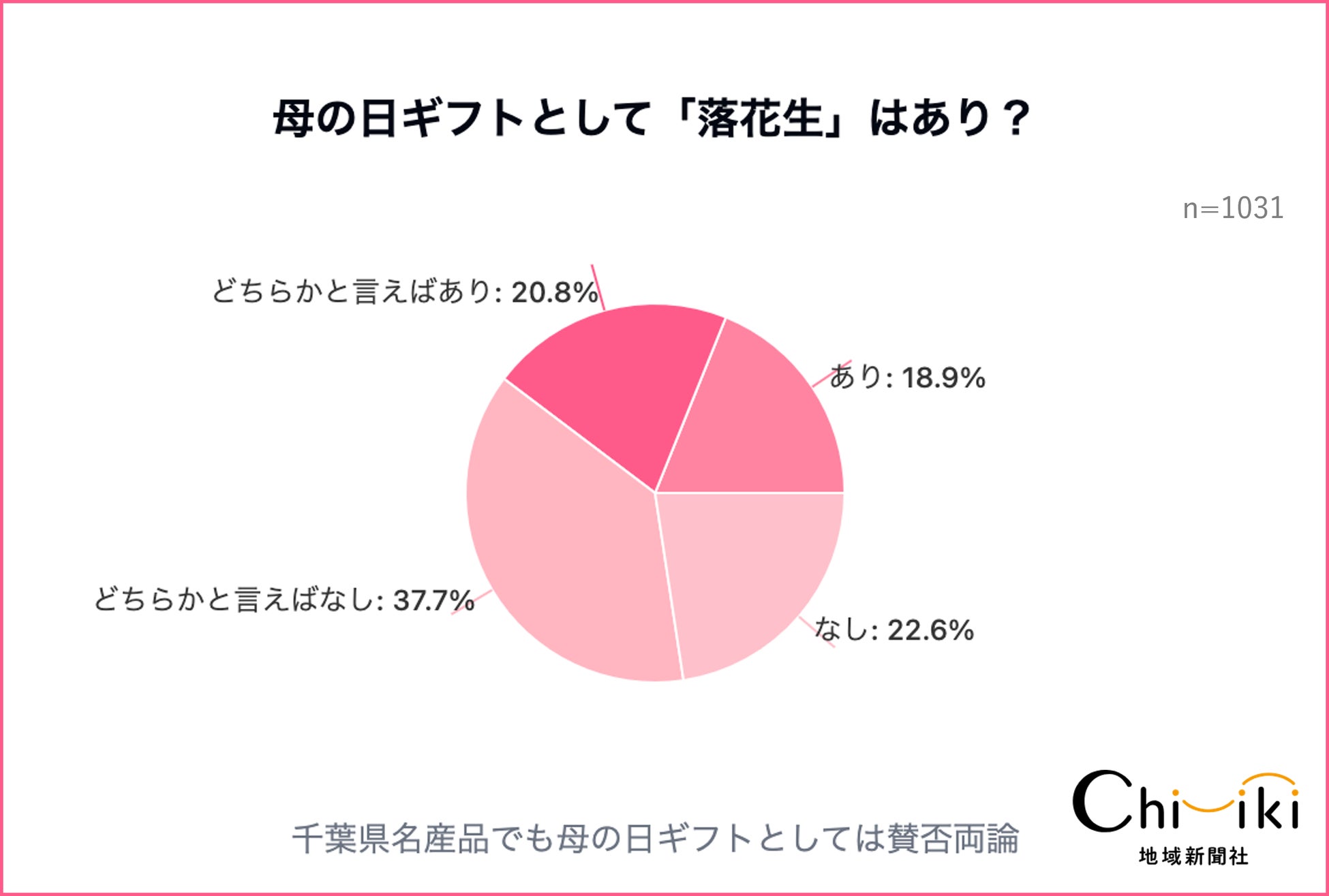 千葉県の名産品である「落花生」が母の日ギフトとして適切かどうかを尋ねたところ、「あり」が18.9%、「どちらかと言えばあり」が20.8%で合計39.7%が肯定的な回答をした一方、「なし」が22.6%、「どちらかと言えばなし」が37.7%と、合計60.3%が否定的な回答をしました。
