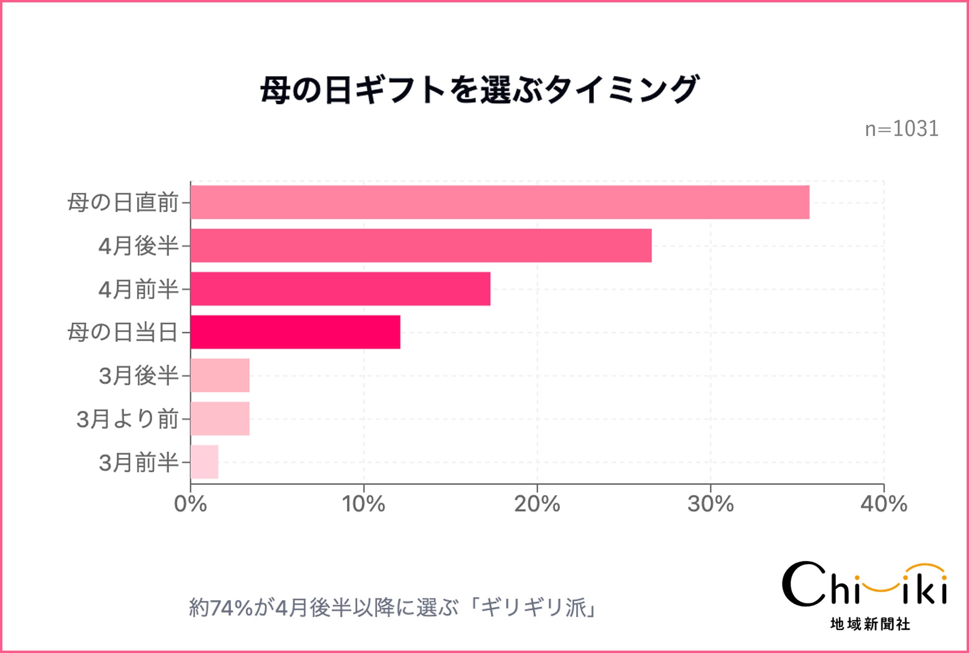 一方、ギフトを選ぶタイミングについては、「母の日直前」が35.7%で最も多く、次いで「4月後半」が26.6%、「母の日当日」が12.1%という結果に。