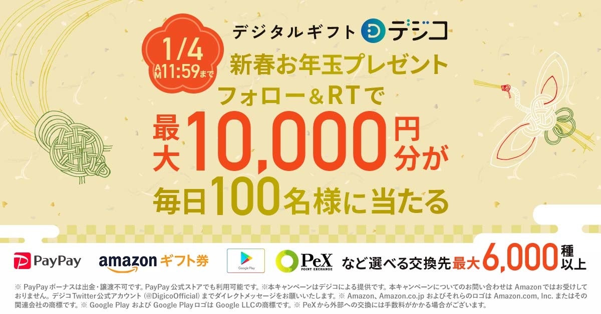デジタルギフト「デジコ」、新春お年玉キャンペーン!Twitter公式アカウントのフォローとリツイートで毎日100名様に最大1万円相当が当たる