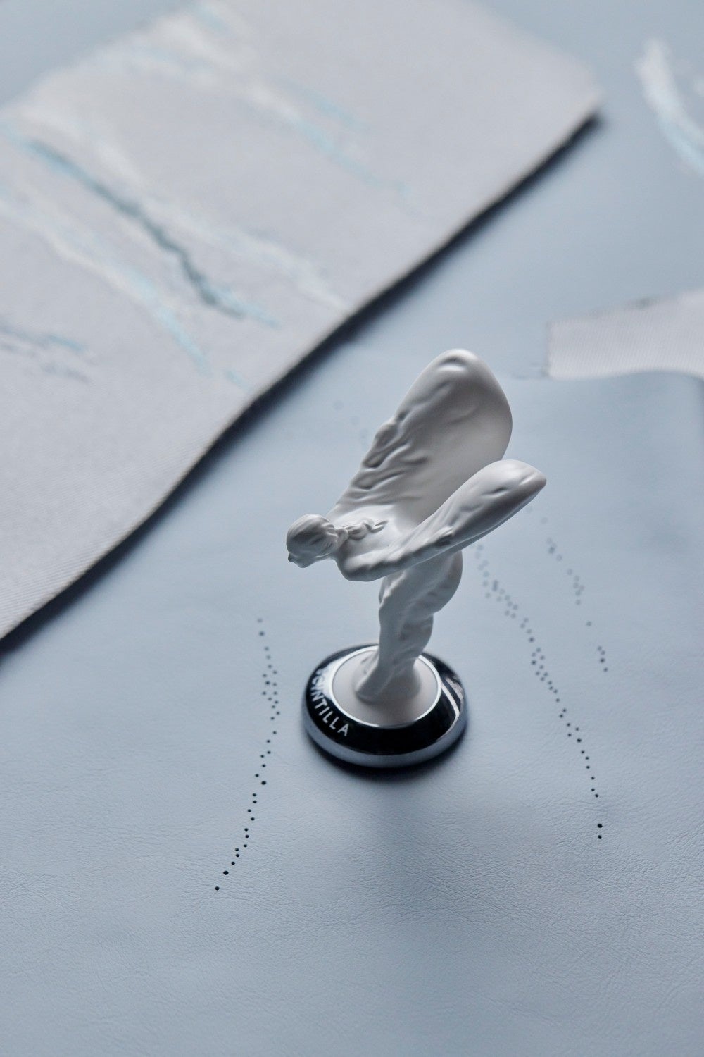 クロード・ジョンソンが手掛けたロールス・ロイスのマスコットの原案は、グローブ・ボックスに隠されたエンボス・プレートに飾られています。1910年に書かれたこの言葉は、プライベート・コレクション、ファントム・シンティラの本質「スピードと静寂性、振動を感じさせない滑らかさ、神秘的に引き出される大いなるエネルギー、そして優雅さを備えた美しい生命体」を見事に表現しています。